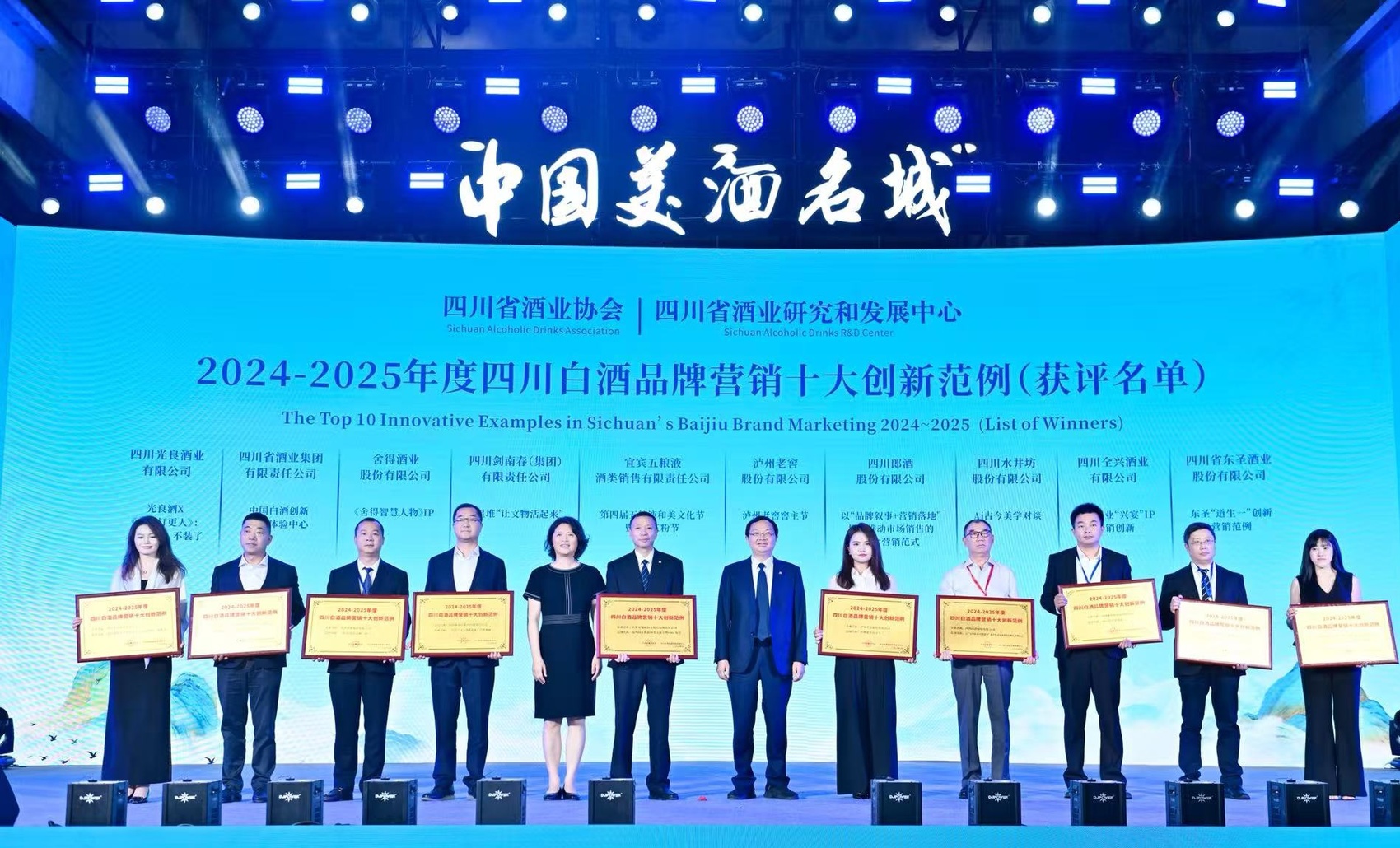 为总结推广四川酒业品牌创新营销经验,打造一批企业认可度高、行业推广性强、社会影响力大的示范标志性成果,四川省酒业协会与四川省酒业研究和发展中心联合评选出2024-2025年度四川白酒品牌营销十大创新范例。开幕式上,发布泸州老窖窖主节、剑南春三星堆“让文物活起来”、舍得酒业《舍得智慧人物》IP等为代表的四川白酒品牌营销十大创新范例,并为获奖企业颁奖。