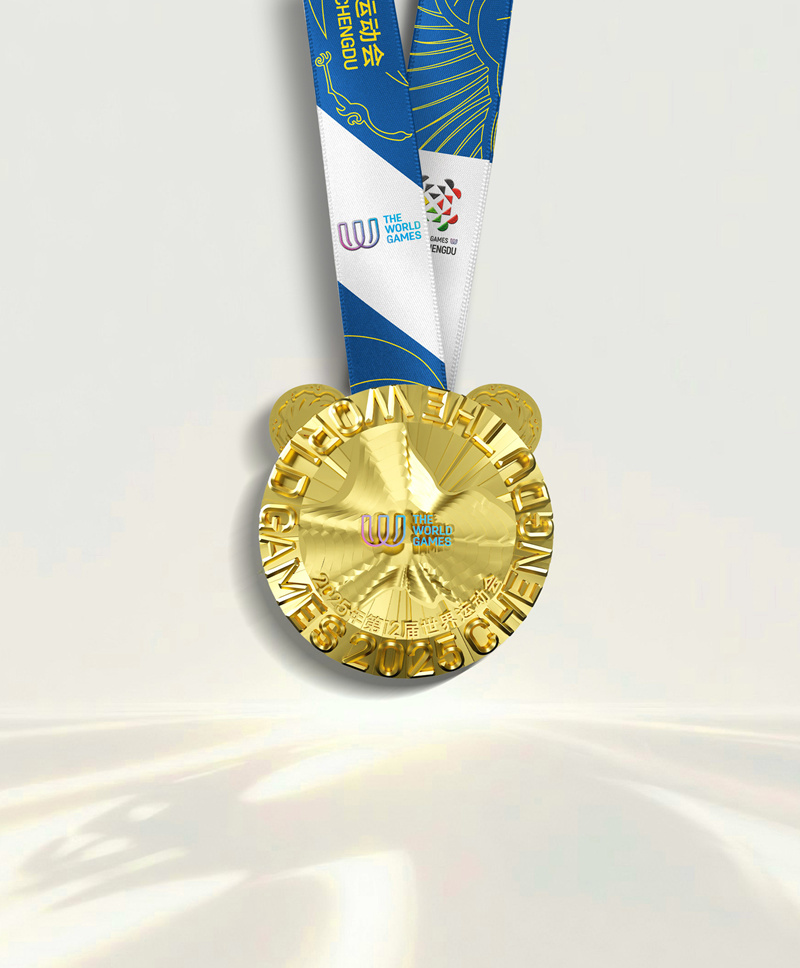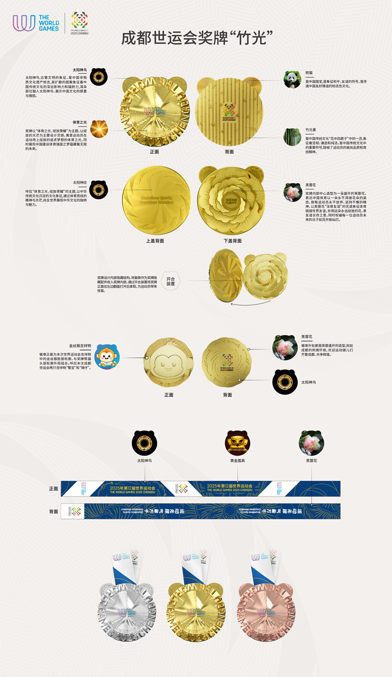 据介绍,“竹光”奖牌的设计,深深植根于中国文化底蕴与成都独特魅力。奖牌正面,国际世运协会徽居中醒目,赛事中英文名称环绕呼应。巧妙融入的太阳神鸟纹饰,与暗合城市轮廓的流动凹凸线条,在底部营造出层层光芒,既彰显中华文明、巴蜀文化的璀璨历史,更象征着运动精神永恒闪耀。