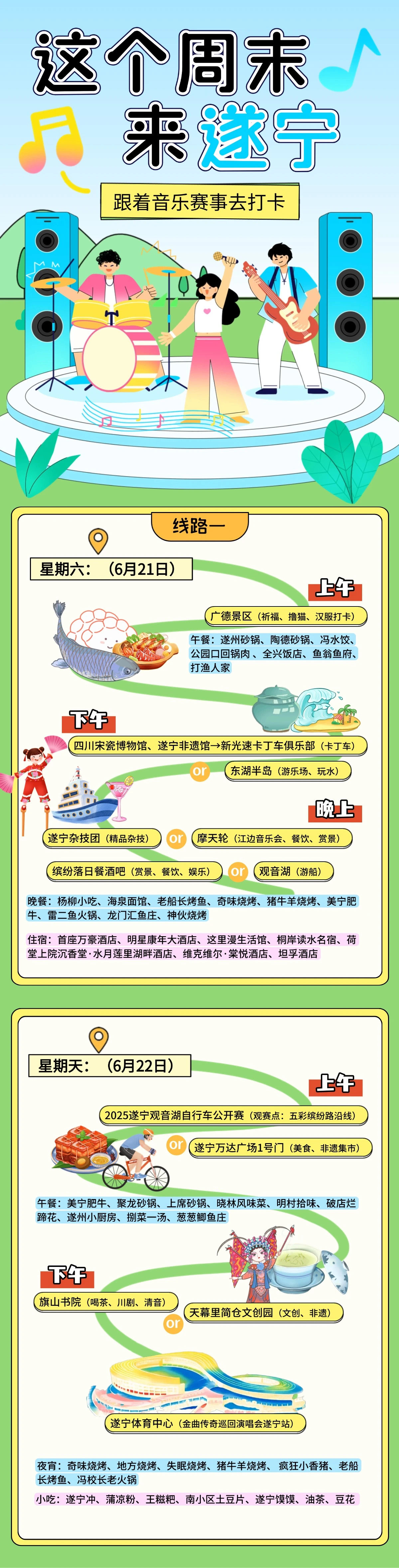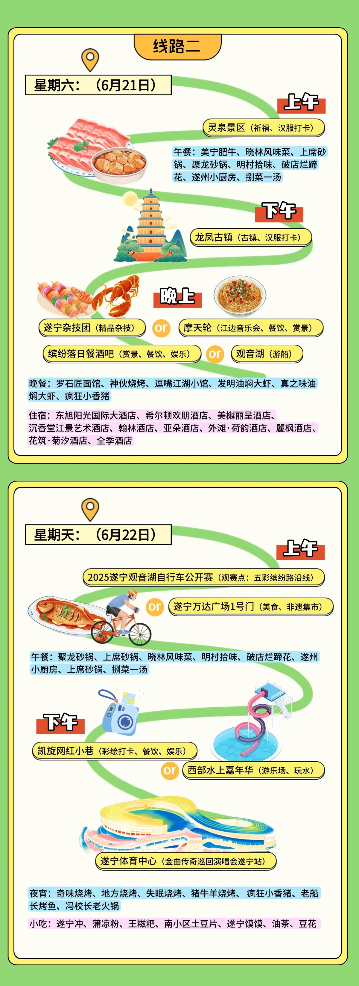就在本周末,遂宁特别推出2条游玩线路,包揽“吃住游购娱”,带你跟着赛事音乐玩转遂宁! 线路包含古刹祈福、精品杂技、观音湖游船、非遗体验等内容,既可以打卡景区、夜游涪江、看演出,还能品遂宁特色美食小吃,沉浸式感受遂宁的城市魅力。