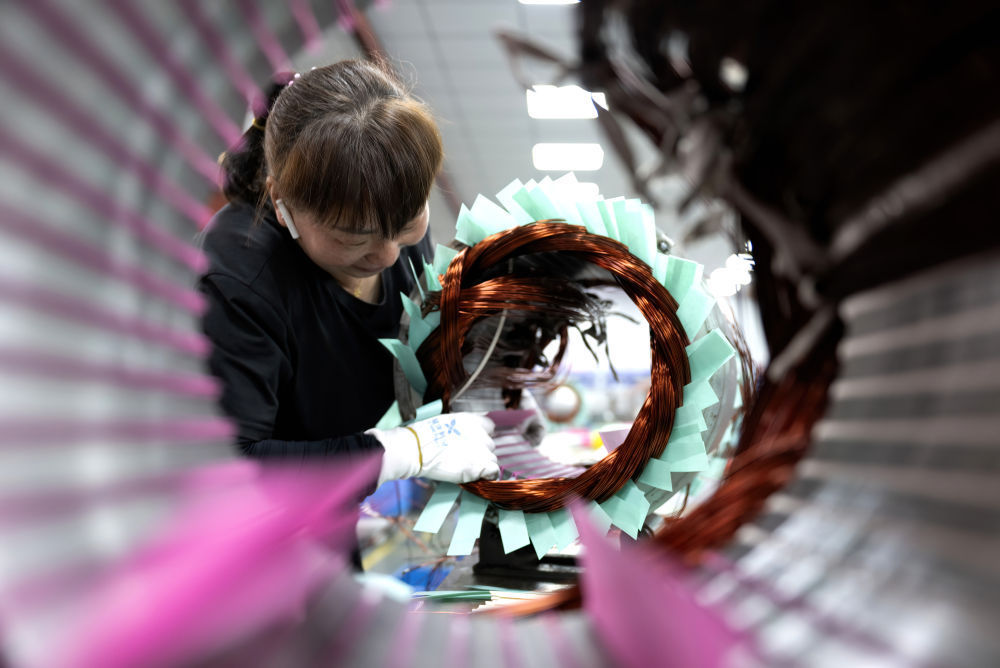 在位于宁德市东侨经济技术开发区的安波电机(宁德)有限公司生产车间,工作人员在安装出口的电机产品(2024年4月16日摄)。近年来,福建省宁德市东侨经济技术开发区通过科技创新、政策引导、金融服务和减税降费等多项措施开辟新领域新赛道,推动区内规上工业企业朝数字化、智能化、绿色化方向发展。新华社记者 魏培全 摄
