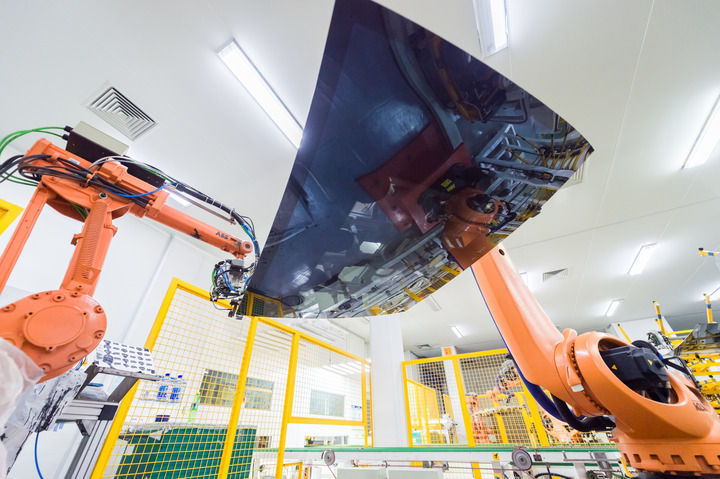 机械臂在福耀汽车玻璃智能工厂的车间生产玻璃产品(2024年4月29日摄)。新华社发