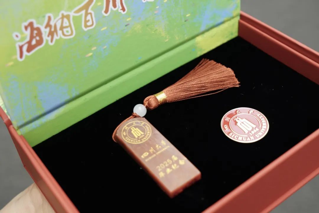 在这个礼盒内,有一枚方形石刻印章、一枚定制校徽和2025届毕业纪念册。印章上刻着“严谨 勤奋 求是 创新”字样,象征着川大精神的传承。校徽上镌刻“海纳百川,有容乃大”,承载着母校的殷殷嘱托。