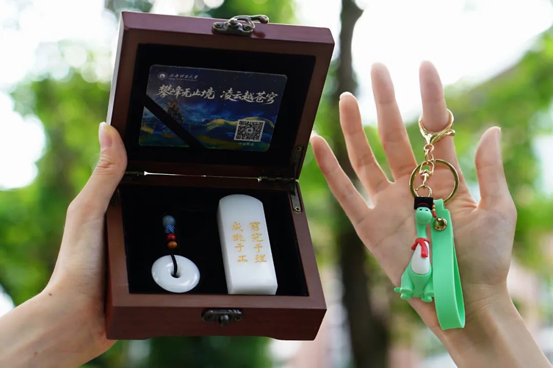 一枚带有合川马门溪龙的钥匙扣,这也是一份从校徽上跳出来的毕业礼物,它化身成理人的小小守护龙,陪伴大家走出校园;一枚地质矿石制成的平安扣,承“环抱平安”之意,将默默守护大家穿越风雨;一个方形汉白玉印章,蕴藏着地壳运动的史诗,校训“穷究于理,成就于工”精雕其上,愿毕业生们继续书写属于成理人的精彩篇章;一张印有校园地标图案的种子卡“盲盒”,卡片上的种子是新生,也是祝愿,愿毕业生在广阔天地间扎根、发芽、生长、绽放。