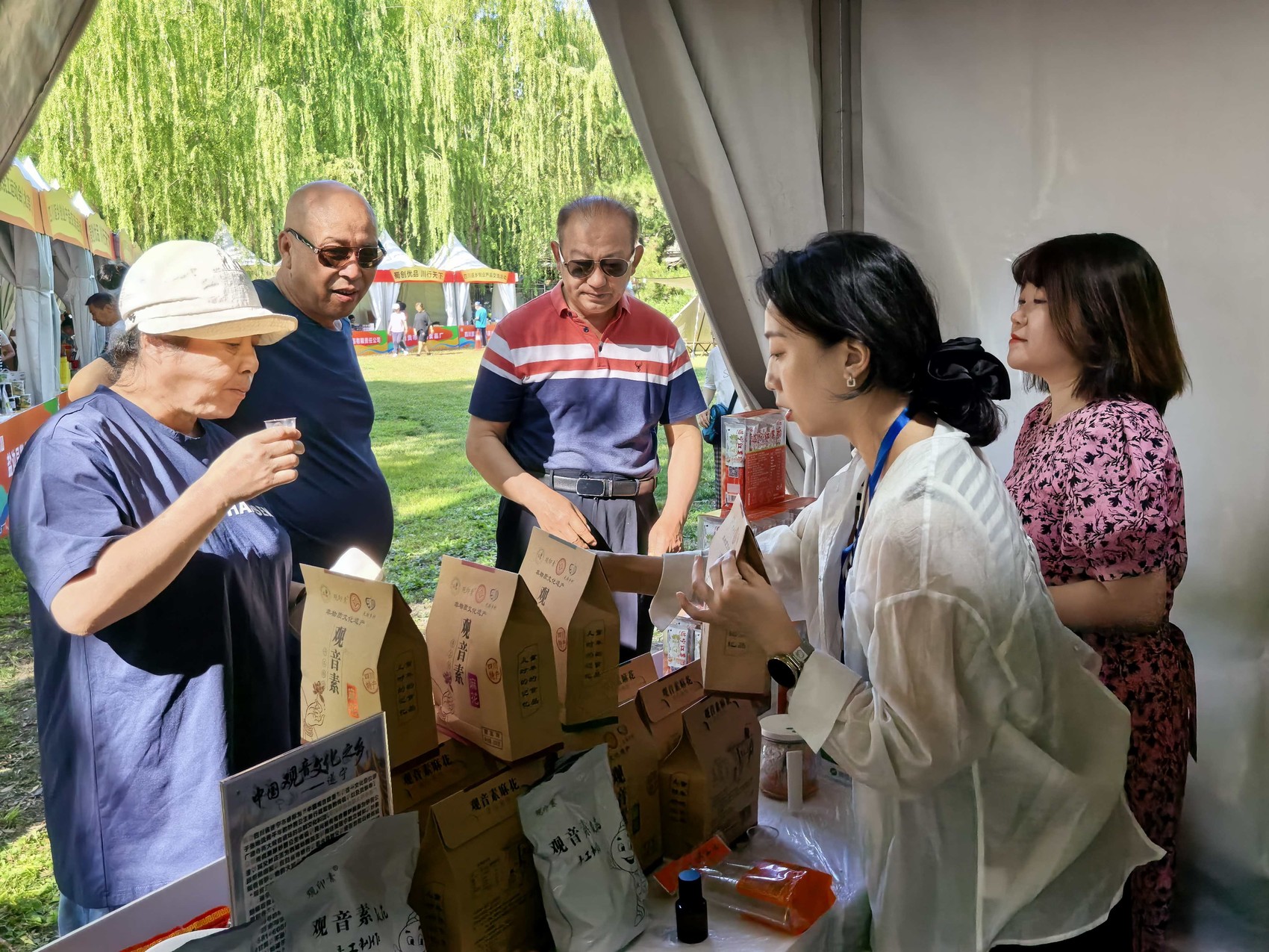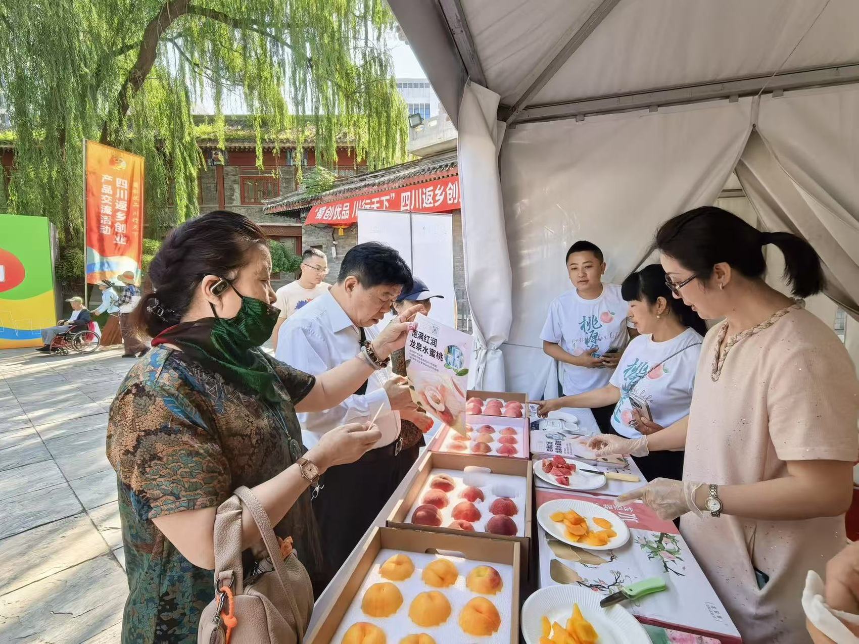 6月20日一大早,北京市东城区柳荫公园的草坪上便热闹起来。来自四川21个市州以及北京四川企业商会的30余家企业在此摆开架势,烟火升腾。刚出锅的军屯锅盔香气四溢,一旁的糖油果子、甜水面摊前排起长队。各地特产摊位更是人气爆棚——冷吃兔、卤鹅、土腊肉、牦牛肉、麻花、银耳等琳琅满目的乡土好物吸引市民及商家前来采购。“这桃子饱满多汁、甜滋滋的,真是太好吃了!”抱着龙泉水蜜桃礼盒的李丽正好和老公张伟在这里晨练,被琳琅满目的四川风情集市吸引得目不转睛,在买了水蜜桃、冷吃兔、卤鹅等商品之后,两人才满意而归。
