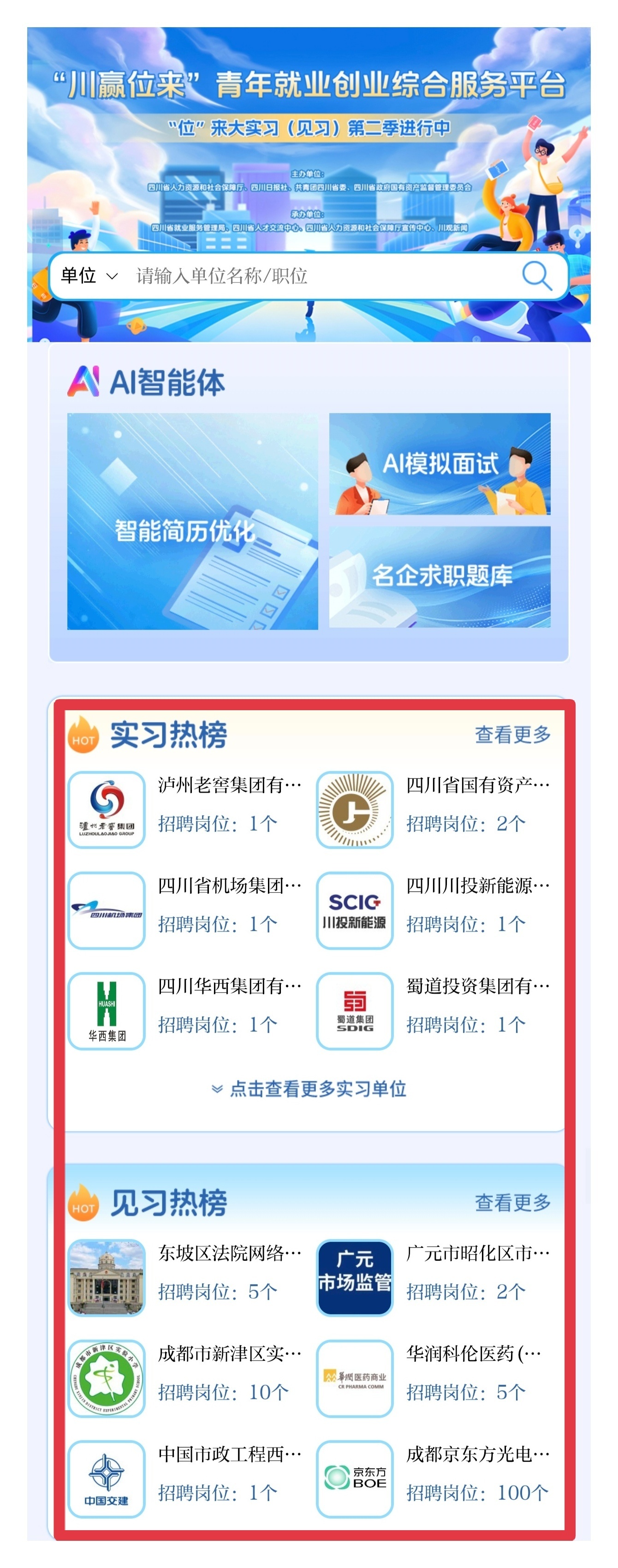 下载并打开川观新闻客户端,点击“川赢位来”青年就业创业综合服务平台 ,找到“实习热榜”或“见习热榜”区域,通过搜索岗位名称,可以发现与搜索岗位相应的所有实习或见习信息。