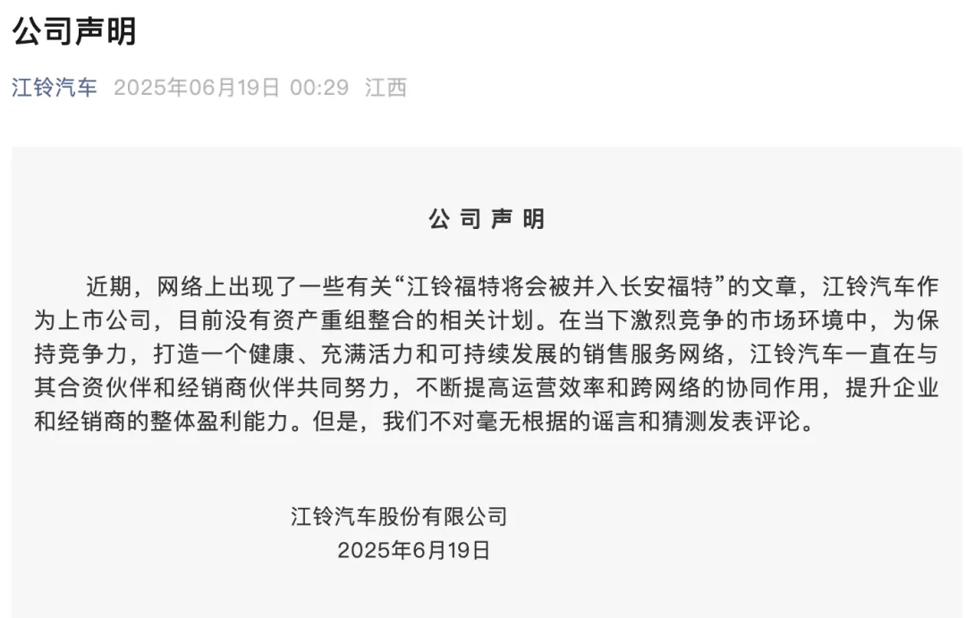6月19日,江铃汽车发布声明称,“近期,网络上出现了一些有关‘江铃福特将会被并入长安福特’的文章,江铃汽车作为上市公司,目前没有资产重组整合的相关计划。”
