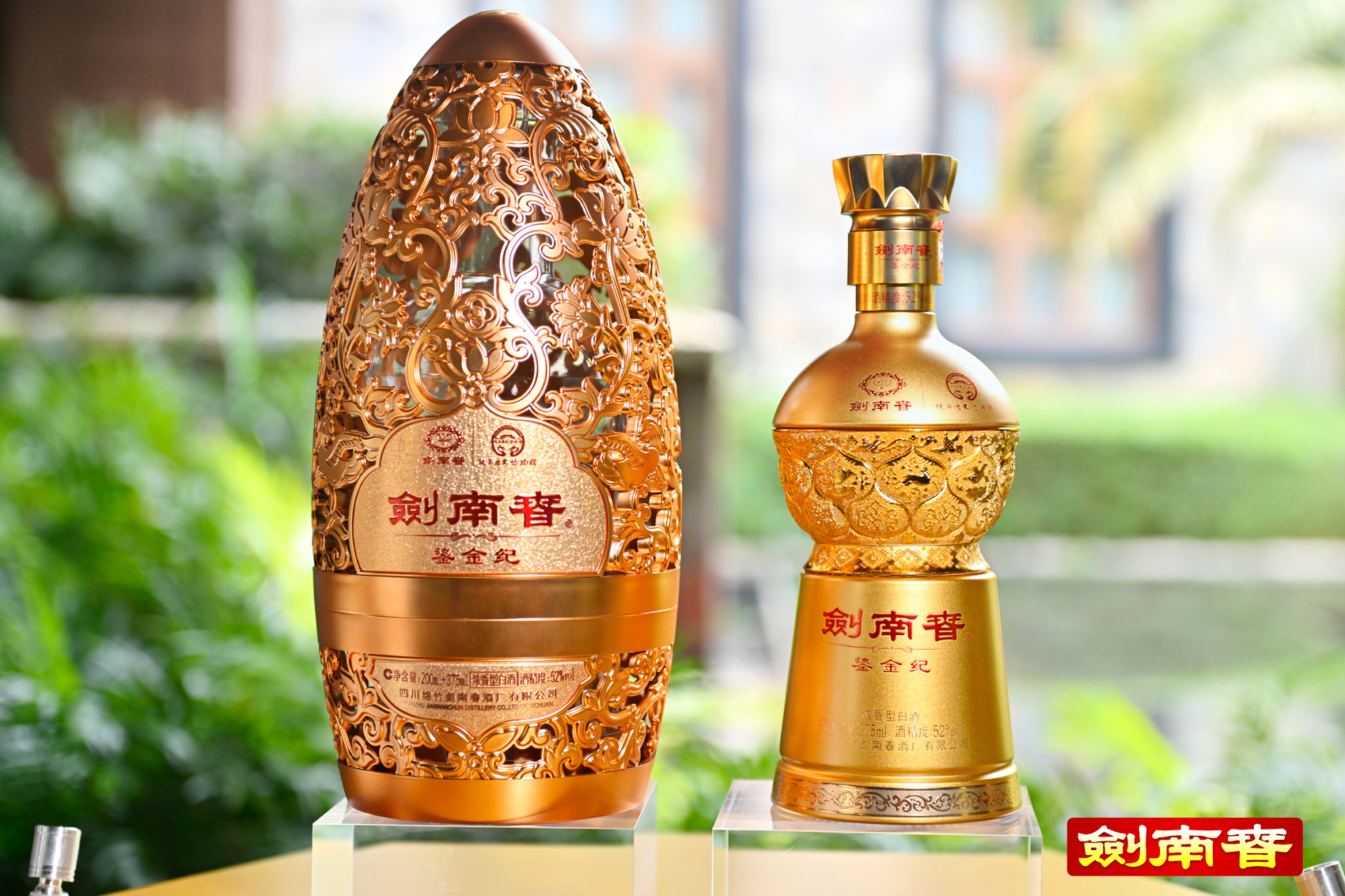 瓶型沿用剑南春经典莲花瓶形,瓶身以鎏金色通体覆饰,尽显雍容华贵。