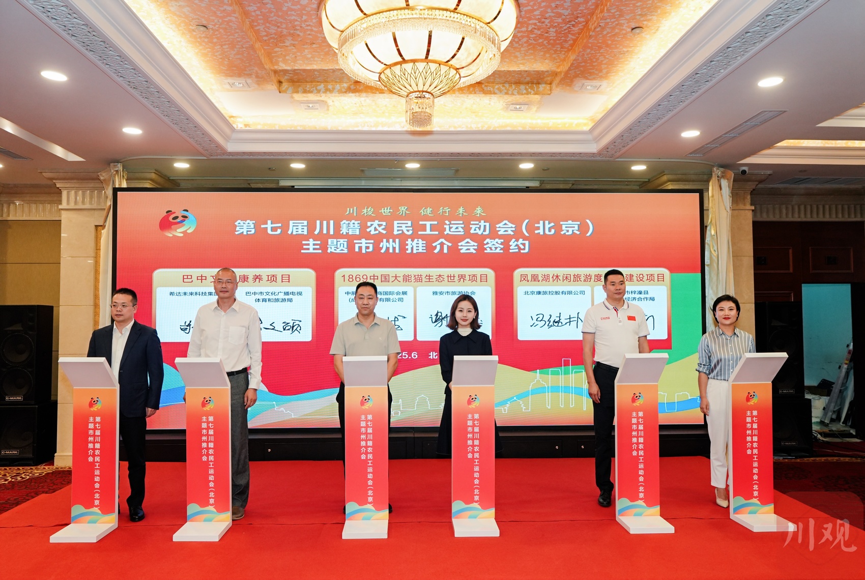 6月20日,第七届川籍农民工运动会主题市州推介会在京举行。活动现场,四川巴中、雅安、绵阳等地分别与希达未来科技集团、中展励德文商国际会展(成都)集团有限公司、北京康旅控股有限公司签订了三个文体旅投资项目,达成意向性合作签约总金额71亿元。来自北京的52家企业、54家旅行社代表参加活动。