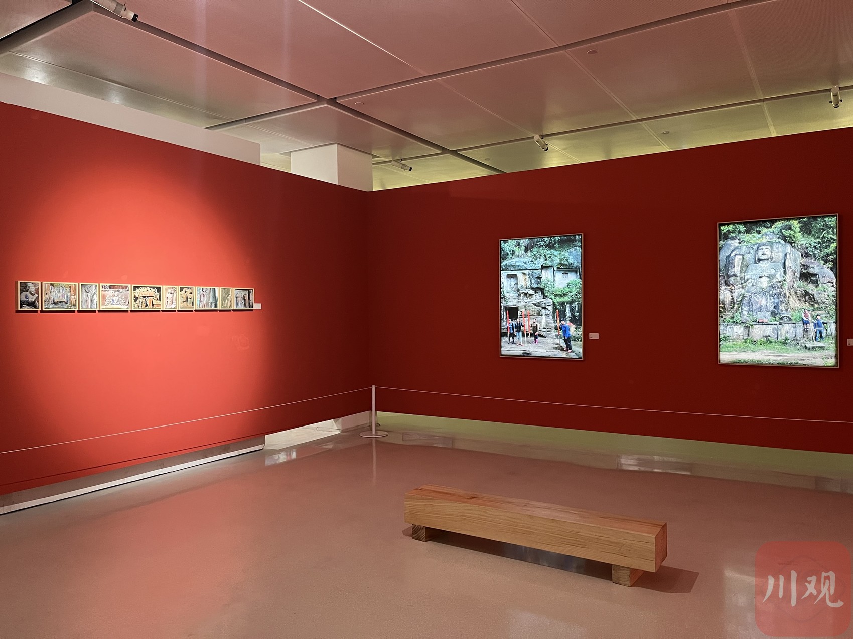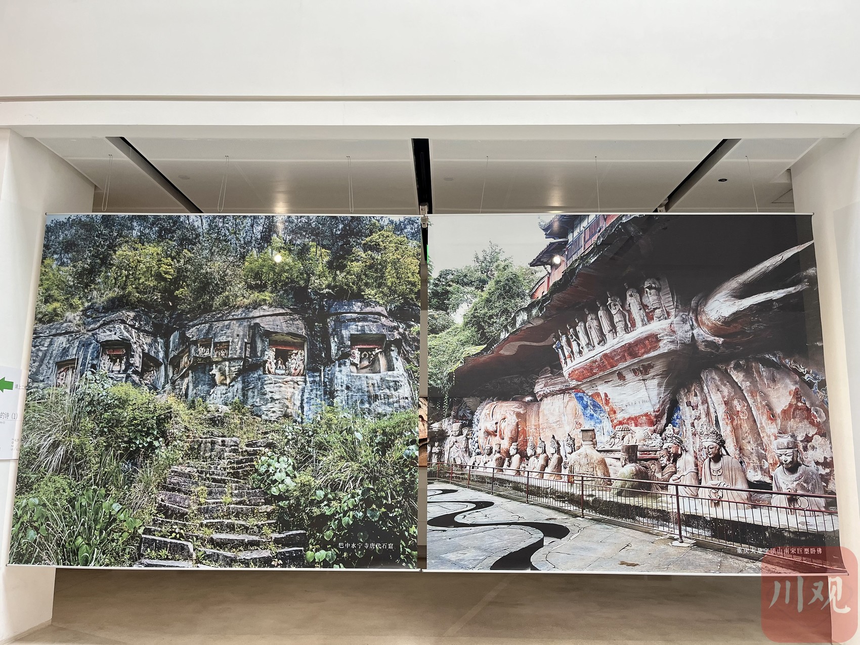 展厅天井上方,来自安岳石刻的飞天造像剪影活灵活现;光线从天井射入展厅,广元千佛崖、邛崃石笋山唐代石窟、重庆大足宝顶山南宋巨型卧佛、资阳半月山唐代大佛等巴蜀经典石窟造像熠熠生辉……