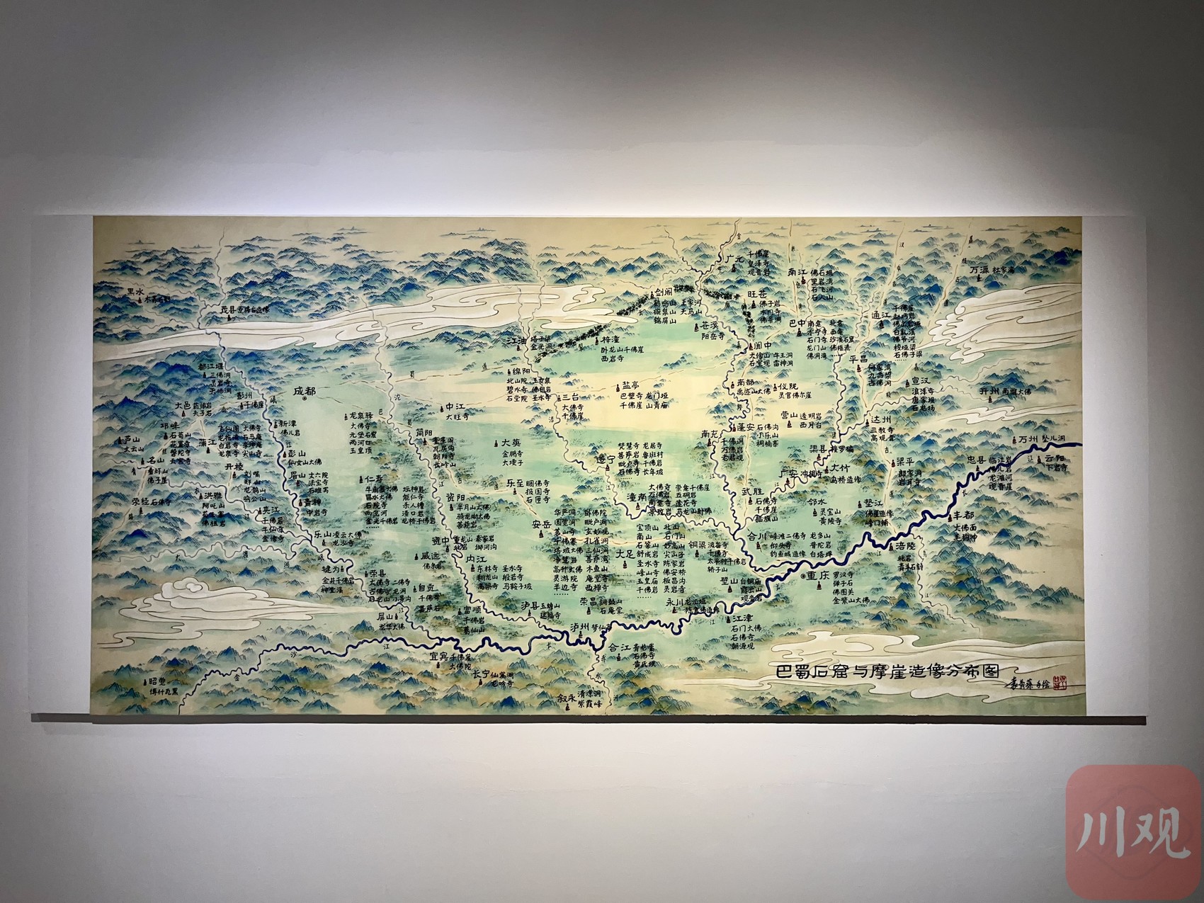 袁蓉荪早年曾跟随四川著名画家赵蕴玉学艺。此次展览中,他发挥绘画专长,手绘了一张“巴蜀石窟与摩崖造像分布图”,展现了川渝地区主要的石窟造像分布。