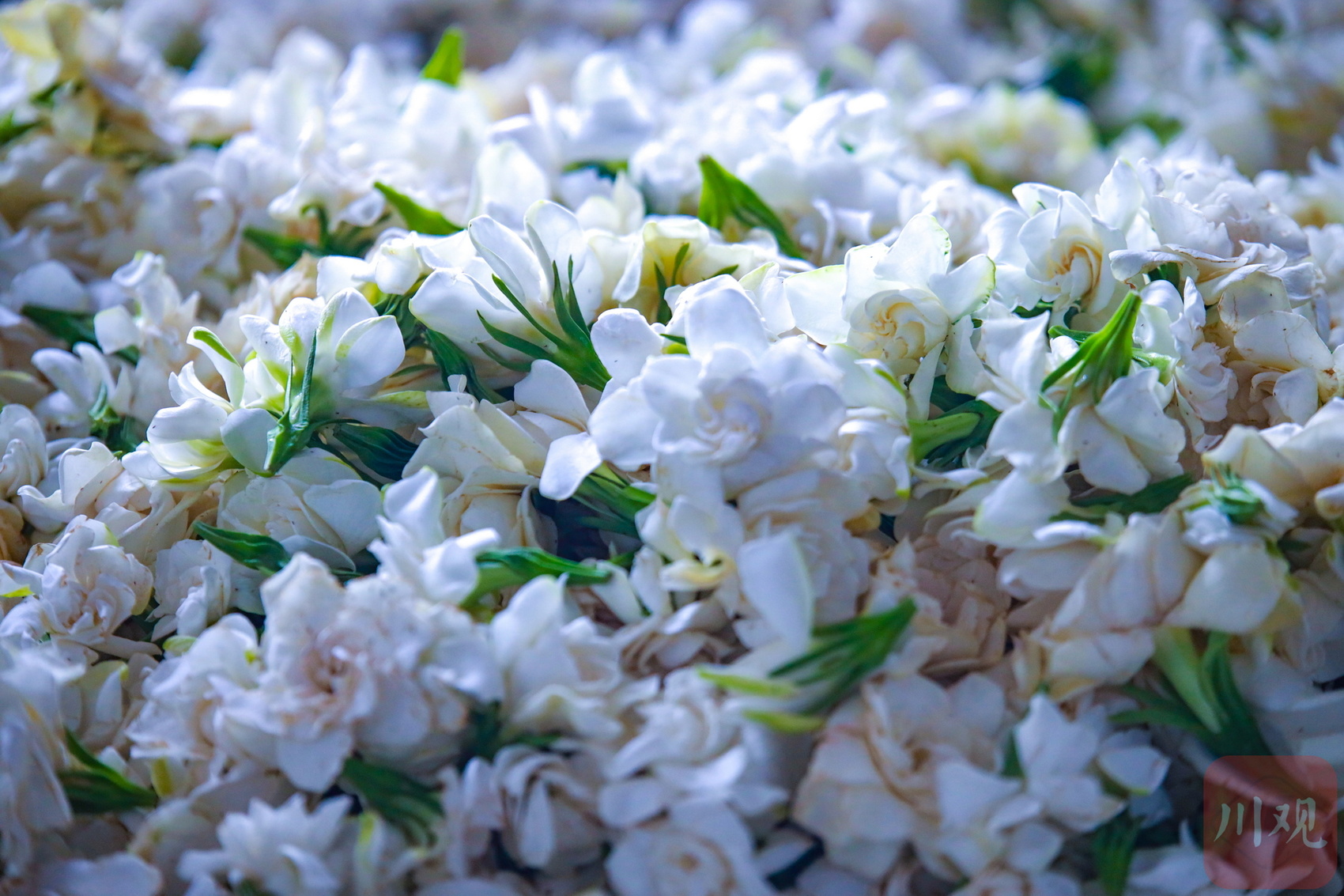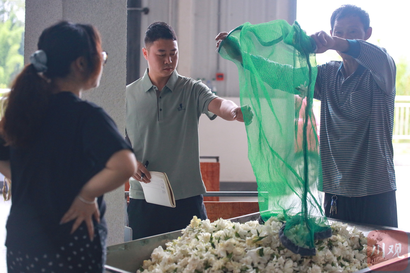 上午10时许,当地新店镇农户潘国锦背来一袋新鲜栀子花。收花工作人员李佳捧起一大把花,埋头深深闻了闻,再拎出来单朵仔细辨别说:“花很香!白净、没水、三层瓣,是很不错的玫瑰栀子,总计176元!”潘国锦边收钱边说:“6点起来采的,最近雨少,有些花骨朵没开,不然还能摘更多好花。”自今年5月起,这里已经从雅安、乐山、眉山等地收购加工了70多万斤栀子花。