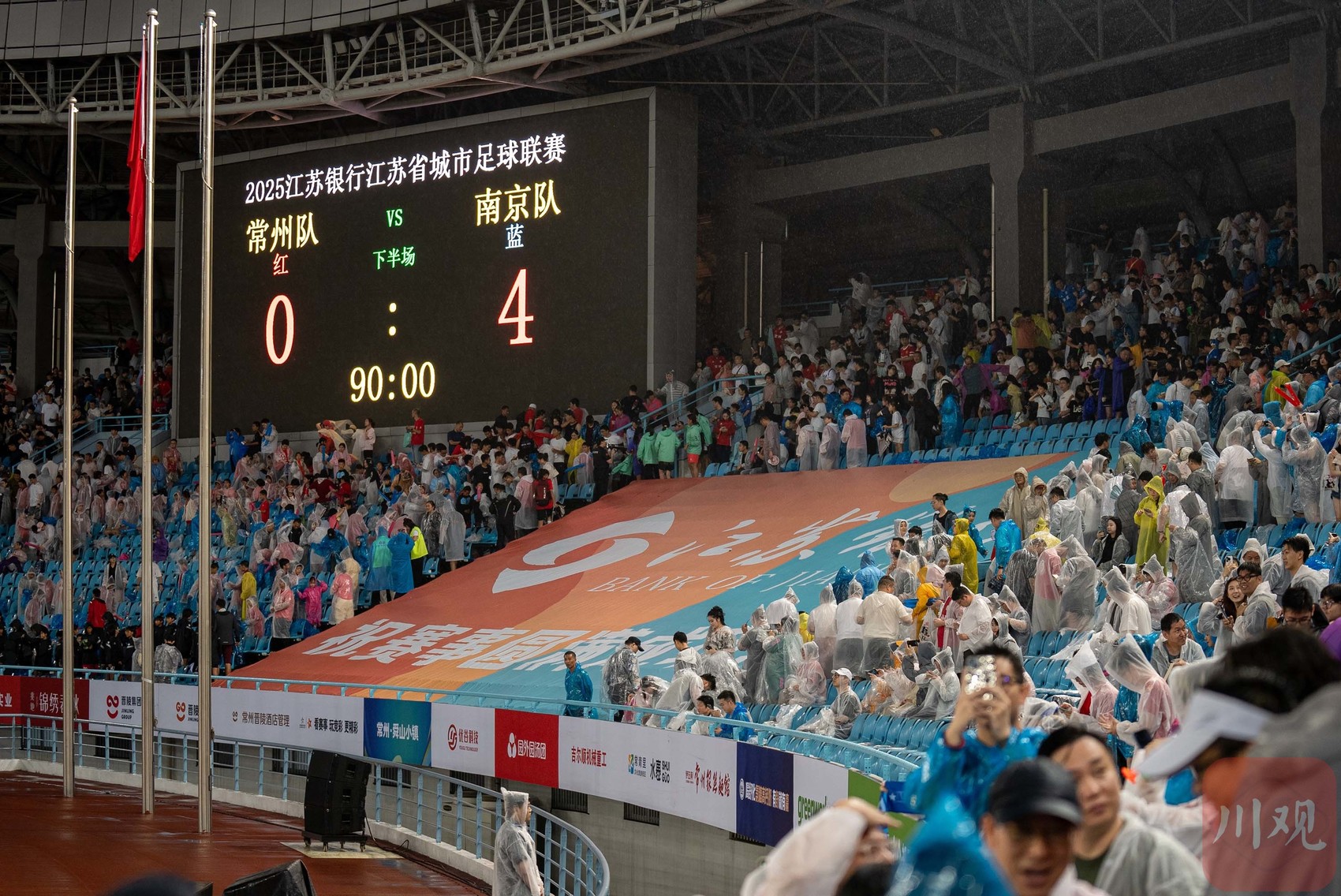 “苏超”第五轮比赛中,尽管常州队主场以0:4负于南京队,遭遇五连败,但是万名球迷冒着暴雨观赛热情不减,刷新“苏超”上座记录,球员场上鏖战,球员场下呐喊,“楚汉”争霸战犹酣。