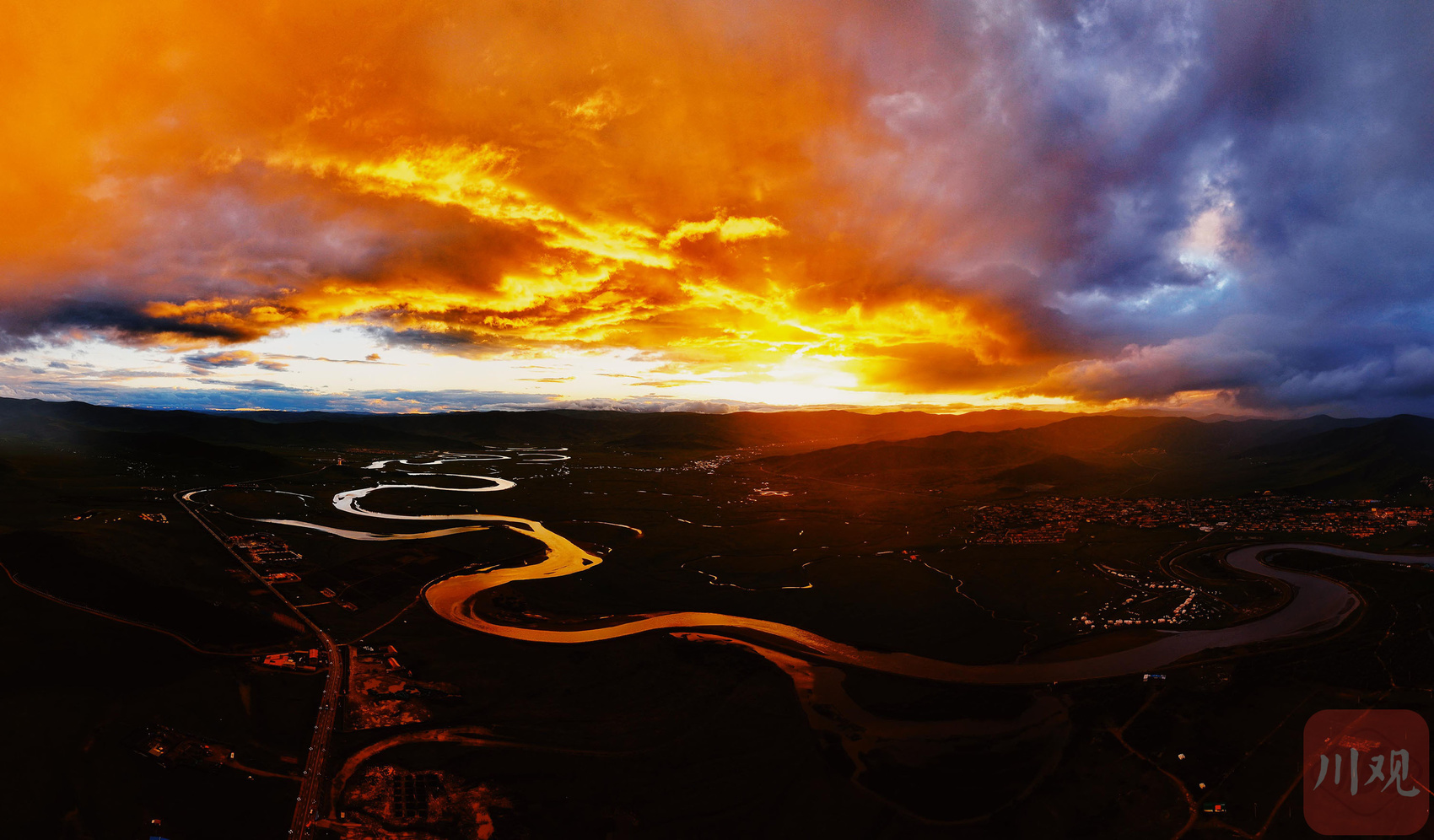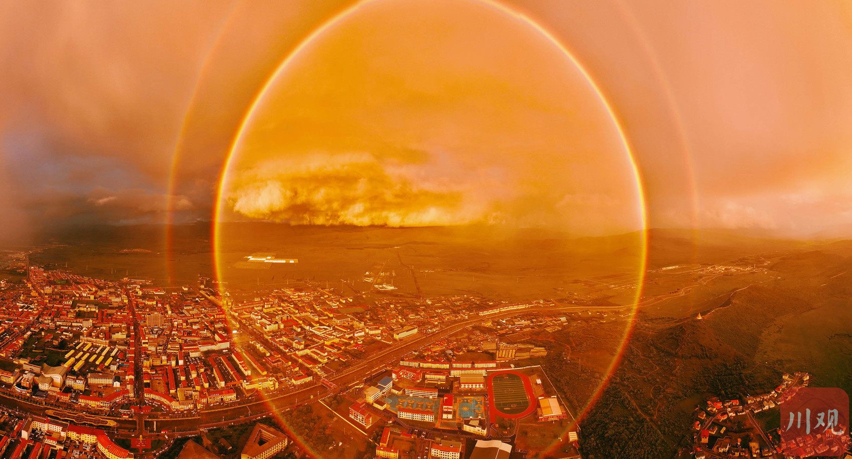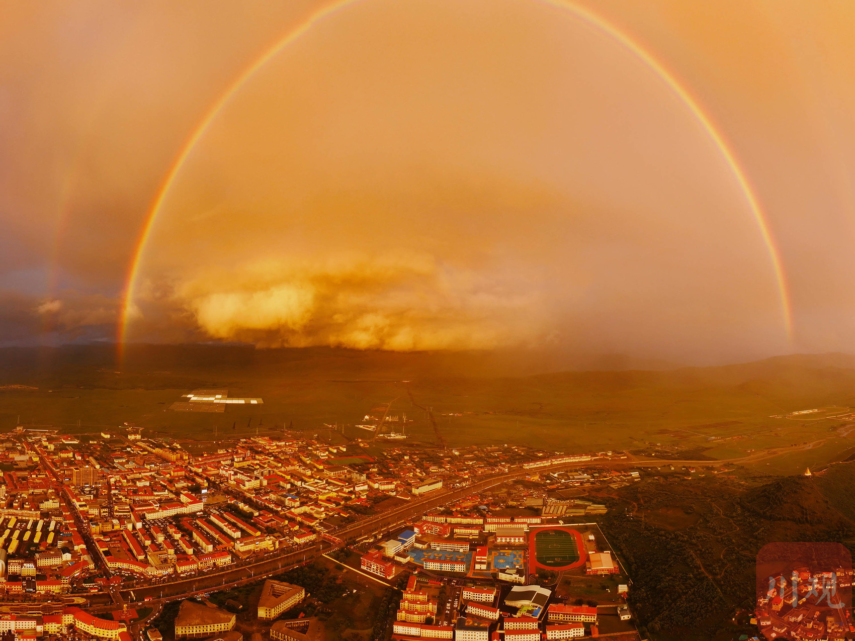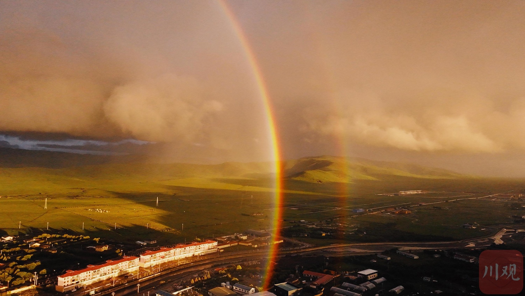 6月21日夏至,傍晚时分,阿坝州红原县迎来阵雨。雨后初晴,县城上空出现一道双彩虹,景象壮观。