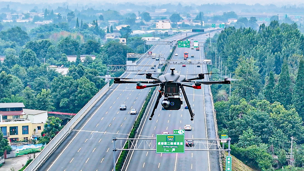 成都交投集团的无人机在成彭高速开展道路巡检。供图/成都交投集团