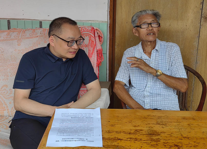 黄劲松与徐长华交流,了解当时叫响“要想富,先修路”口号的情况。眉山市党史和地方志编纂中心供图