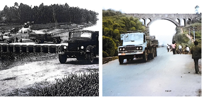 20世纪80年代,眉仁公路改造前(左图)后(右图)对比。眉山市党史和地方志编纂中心供图