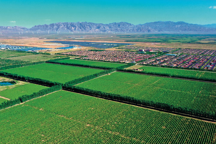 如今的闽宁镇,加速拥抱新质生产力,又有了新名片——“绿电小镇”,一块块蓝色光伏板整齐排列在空地、屋顶。(国网宁夏电力有限公司供图)