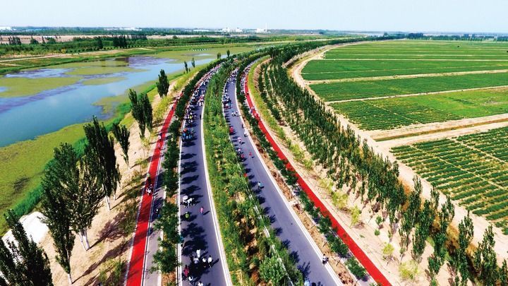 宁夏银川市永宁县闽宁镇的西部水系航拍图片。(永宁县委宣传部供图)