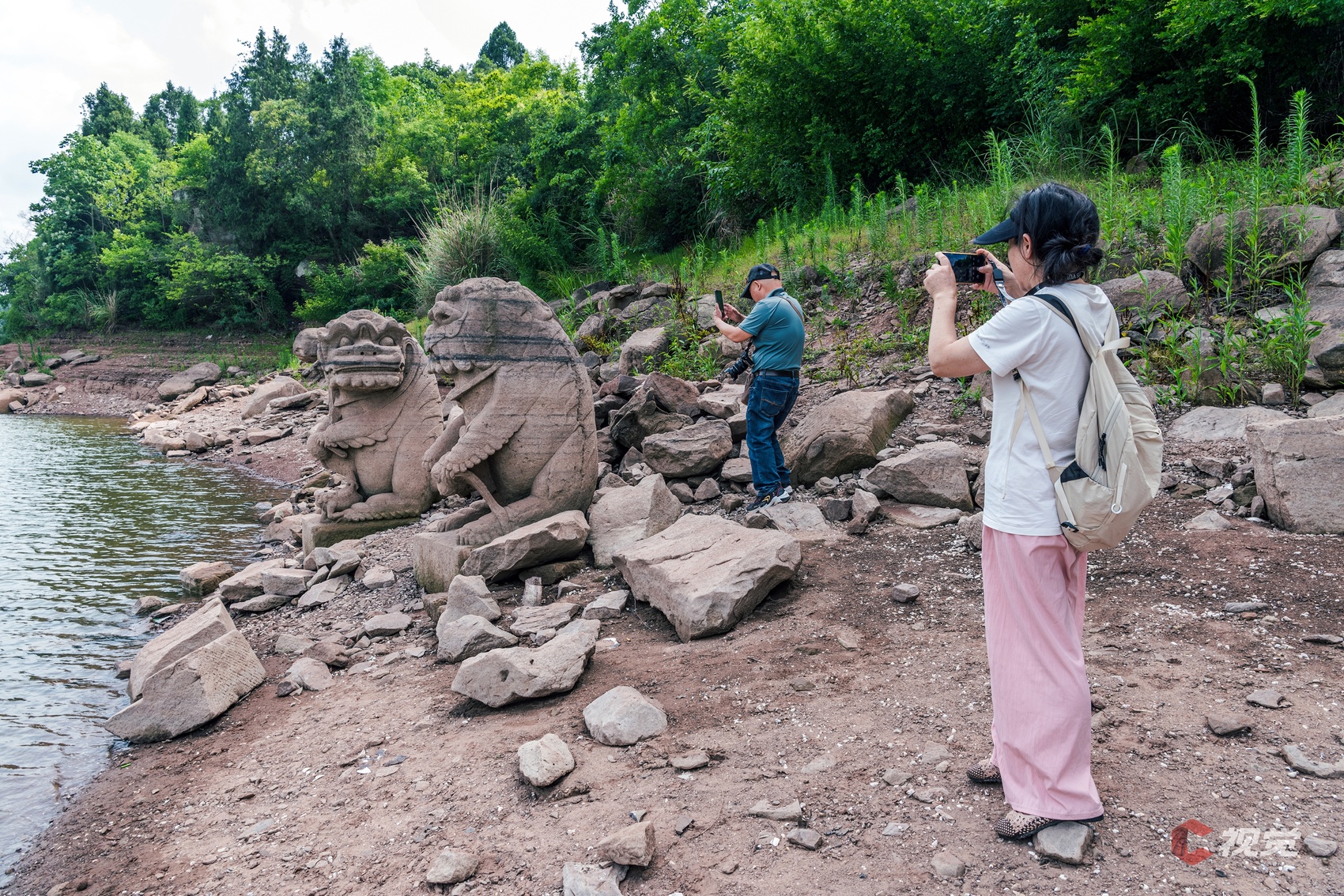 6月22日,水库里露出的千年石刻吸引了游客前来拍照打卡。
