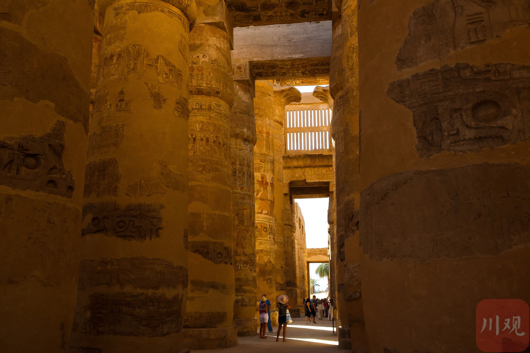 卡纳克神庙巨型石柱擎天而立,柱身象形文字斑驳。