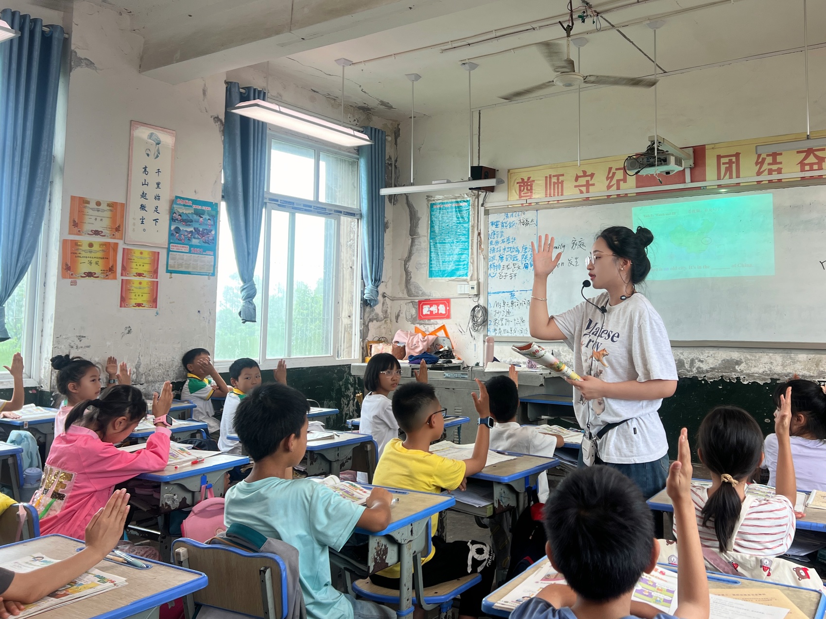 教学环境也带来不少困难。陈言支教的观塘镇小学校,教学资源相对匮乏,没有现代化教学设备,而英语教学急需情境导入。陈言引入小组积分制与专题趣味活动,带领学生制作观塘镇地图,用英语标注位置。
