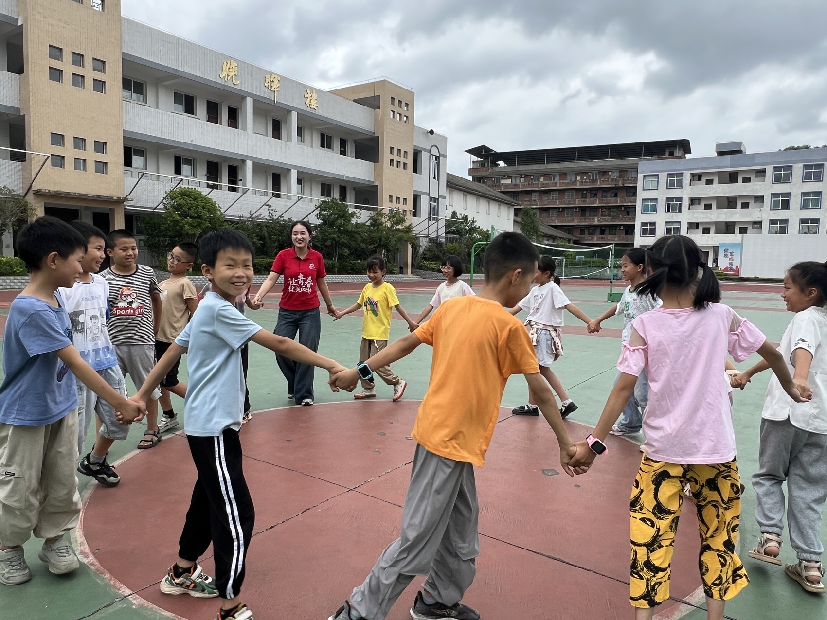 在课间休息时间,陈言陪学生们玩耍