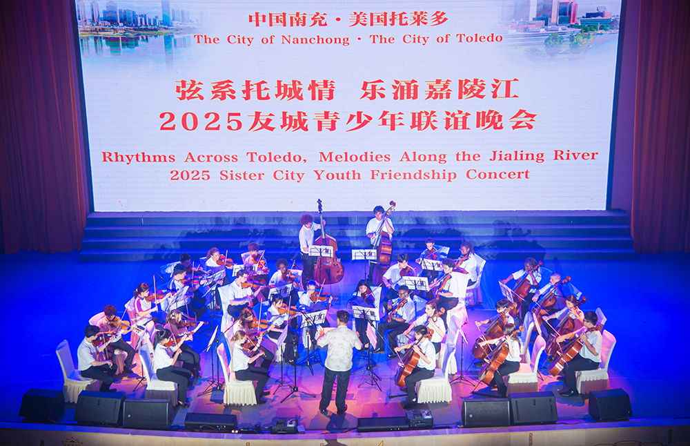 在6月20日“弦系托城情·乐涌嘉陵江”2025友城青少年联谊晚会上,弦乐团演奏了《嘎达梅林》《仙纳多幻想曲》《阿帕拉契亚的回忆》等中外经典乐曲,《茉莉花》《北京喜讯到边寨》《梁山伯与祝英台》等中国民歌,南充市带来了武术表演《中华少年》《川剧变脸》、杂技《太极坛韵》、大木偶《千里共婵娟》等精彩节目,两国青少年用艺术勾勒出文化交融的绚丽长卷,架起了中美青少年友好的音乐之桥。