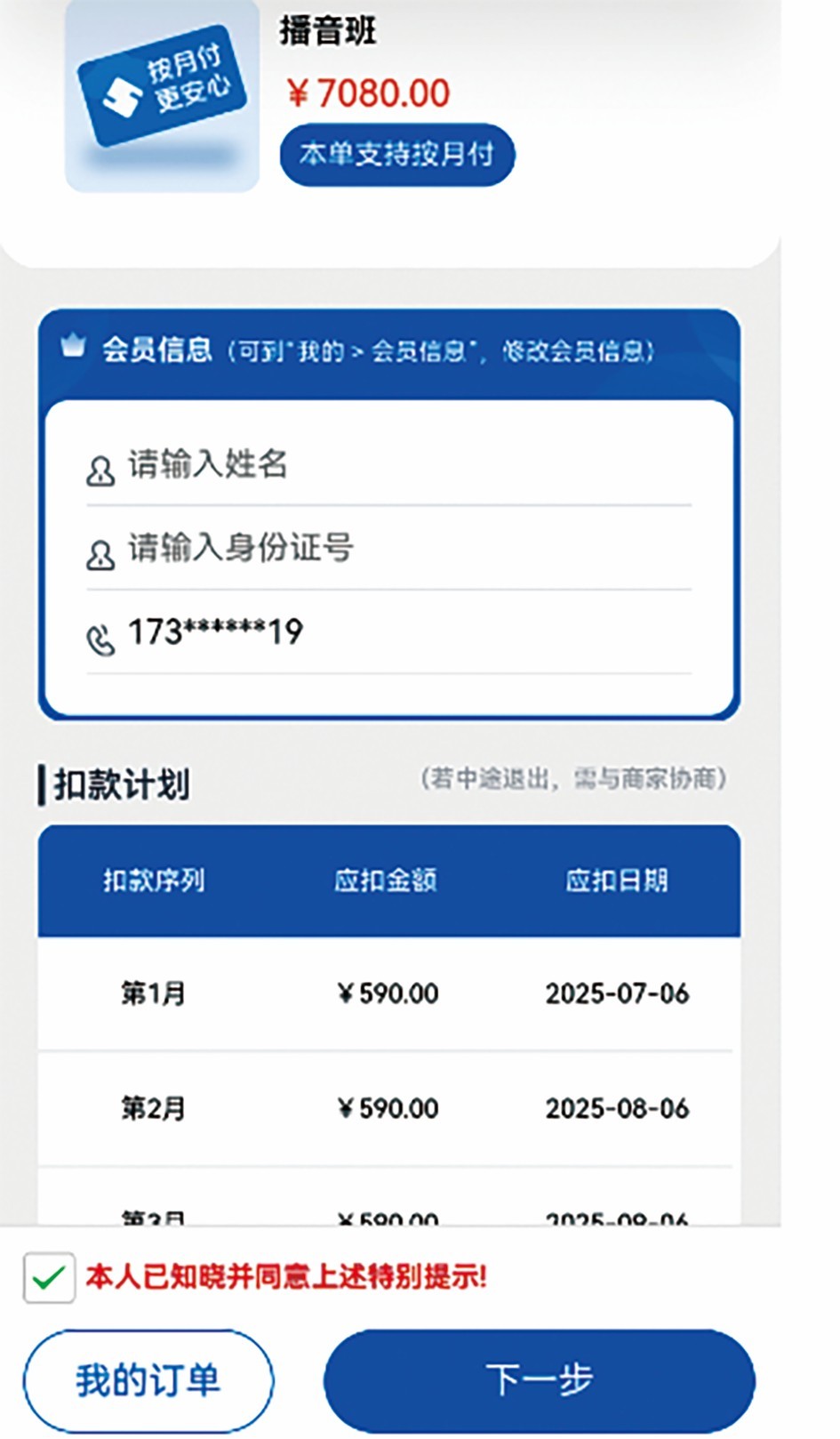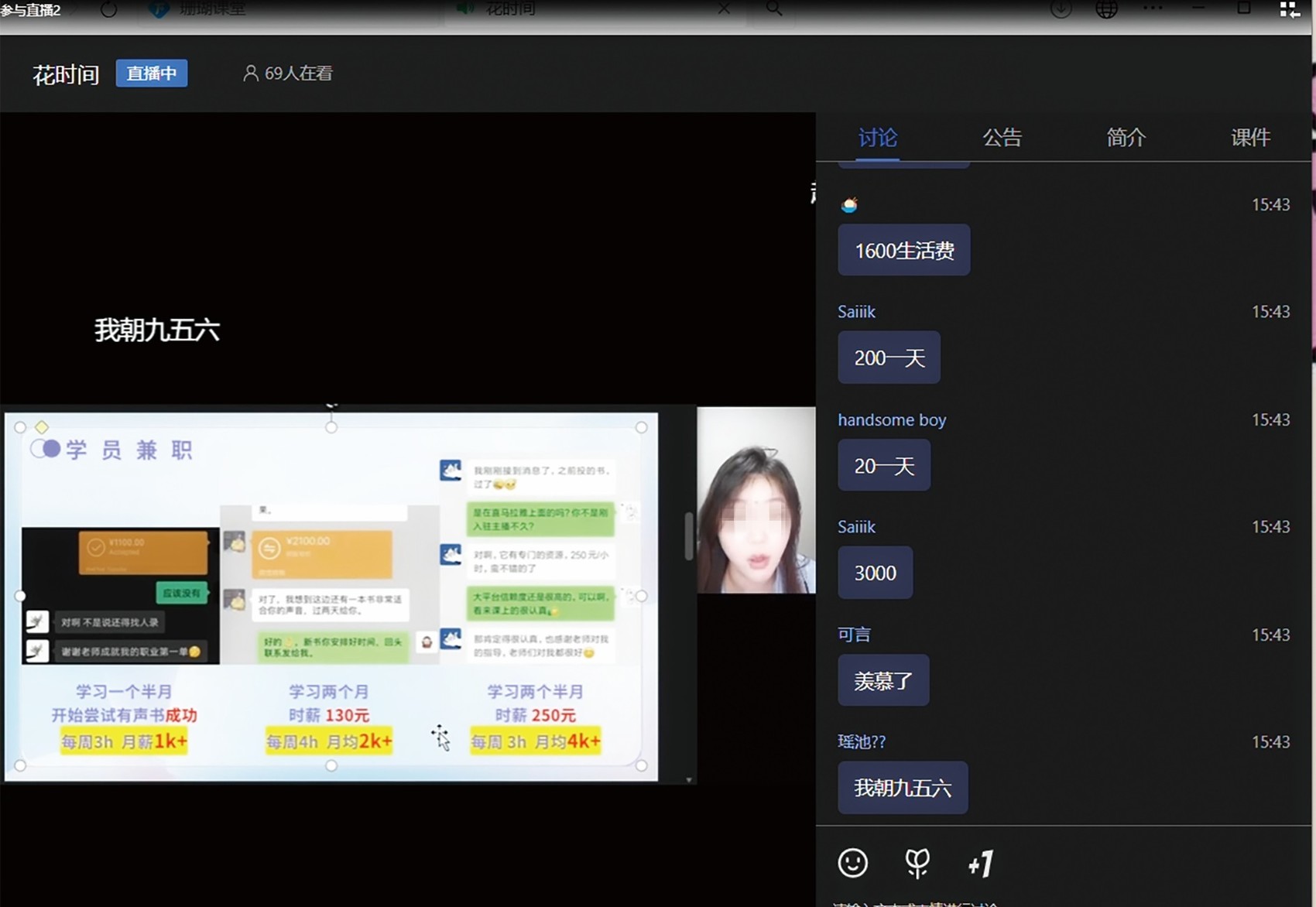6月5日,记者通过小红书一篇帖子后台私信添加了播音配音老师阳阳(化名),对方从年龄、工作、空闲时间、是否有配音基础等方面对记者进行初步了解后,便开始介绍起播音配音兼职薪资区间、兼职平台、接单渠道、兼职分类、收益情况等,并强调“每月至少能赚600元”。经过短暂的交流,阳阳为记者“申请”到一节90分钟的免费直播培训,同步提供播音配音课前预习资料。直播间内,培训老师通过现场展示配音,与直播间观看者互动问答调动气氛。在展示完“优秀学员”的兼职收入后,便宣称直播间前6个名额预定,可以享受内部助学分期,参与此次课堂可享受首月学习300元优惠,保质完成课程享受“百分百接单保障”“保底薪资保障”。直播结束后,阳阳立刻拨打语音与记者确认是否要购课,随后给记者发送签订协议二维码,并需要填写身份信息、家庭住址、联系方式等信息。面对记者提出的“为何要填写这些信息”等问题,阳阳并未直接回复,只是表示这些信息都会保密,让记者不用担心。