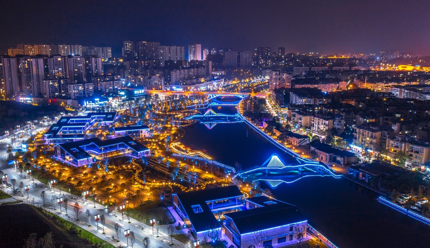 灯火辉煌、满河风光。从賨城里出发漫步西溪河畔,人与水的亲密邂逅、生态之城与幸福生活的美好体验扑面而来——