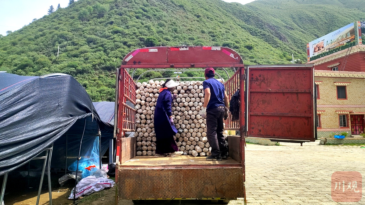 6月17日,在壤塘县吾伊乡食用菌菌种繁育中心,石里乡下大石沟村党支部书记索更将一袋袋花菇菌包整齐码放在货车车厢里,准备拉回自家的种植大棚,“去年政府搞示范推广,我积极参与,赚了1万多块钱。今年我又投钱扩大了120平方米的大棚。”