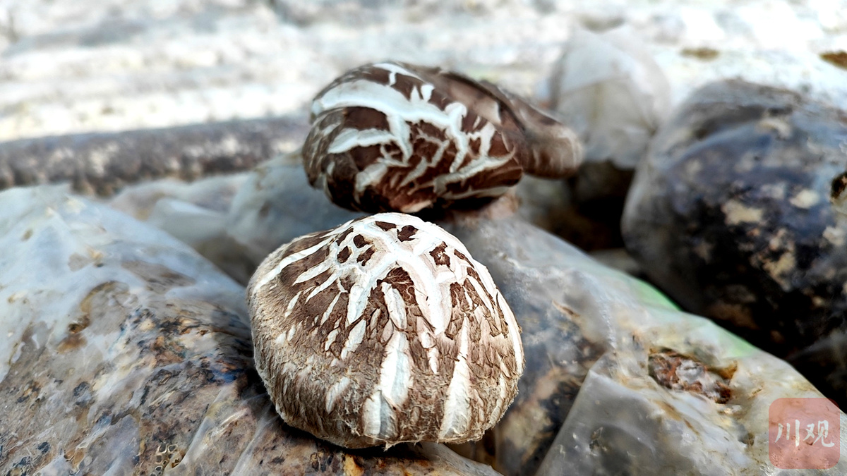 记者跟随唐述刚来到大棚里,看见菌袋上长出的花菇表面布满裂纹,形似龟壳上的纹路。“这种我们叫它龟背菇,口感更好,营养价值更高。在大型商超里面,它的价格是普通花菇的4到5倍,可以卖到20元/斤。”唐述刚解释说,能种出这样的龟背菇,高原上较大的昼夜温差是一个重要因素。
