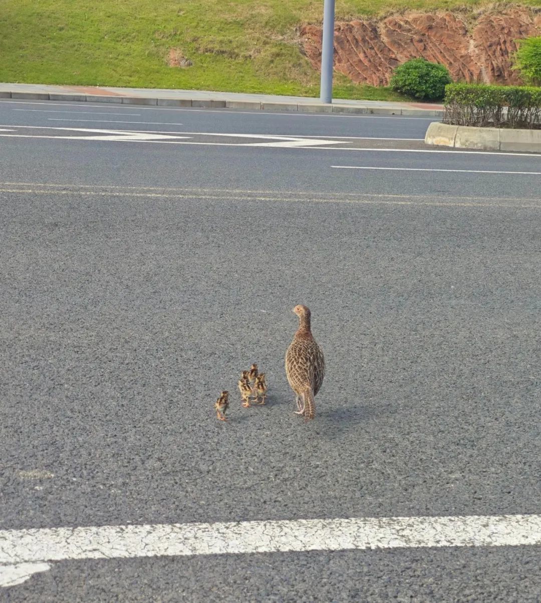 近日,家住四川天府新区的胡先生在与家人从鹿溪河回家路上偶遇环颈雉(zhì)(俗称野鸡、山鸡)妈妈带着6个宝宝横穿马路,他和旁边车道的司机都停下车礼让,并用手机记录下来这暖心一幕。