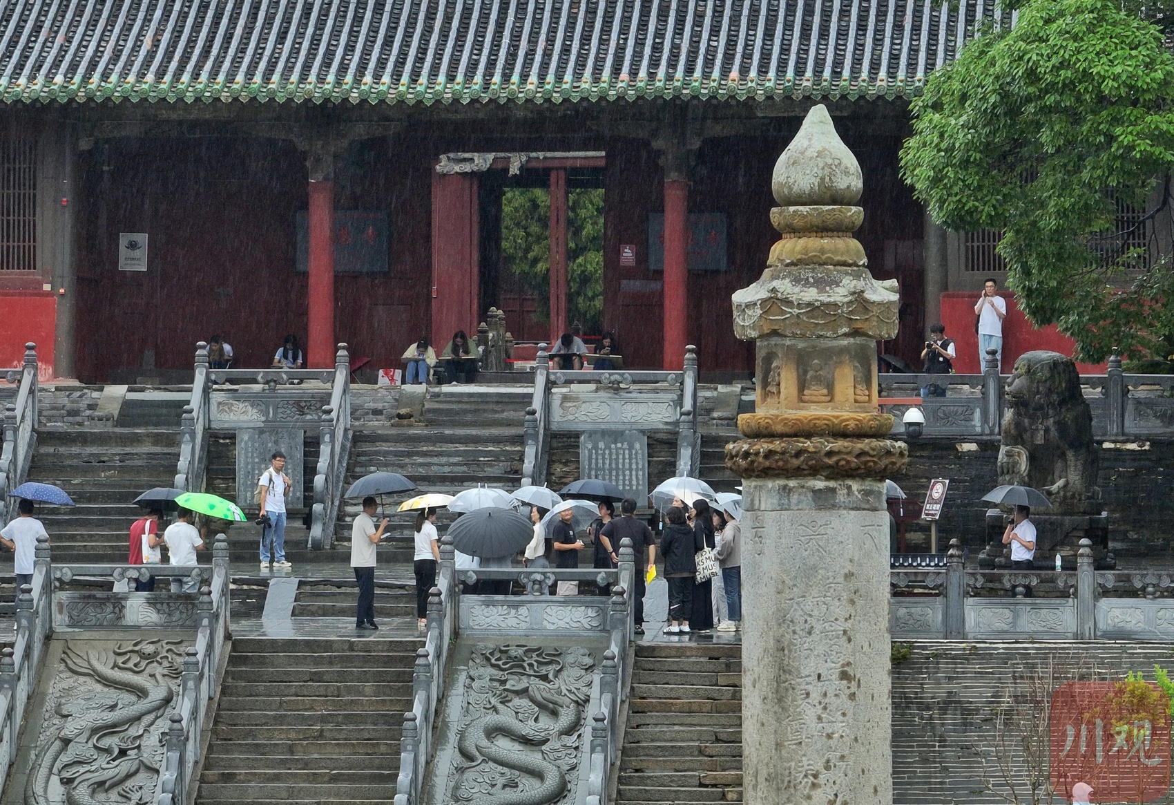 6月24日,下着细雨,来平武报恩寺游览的游客。