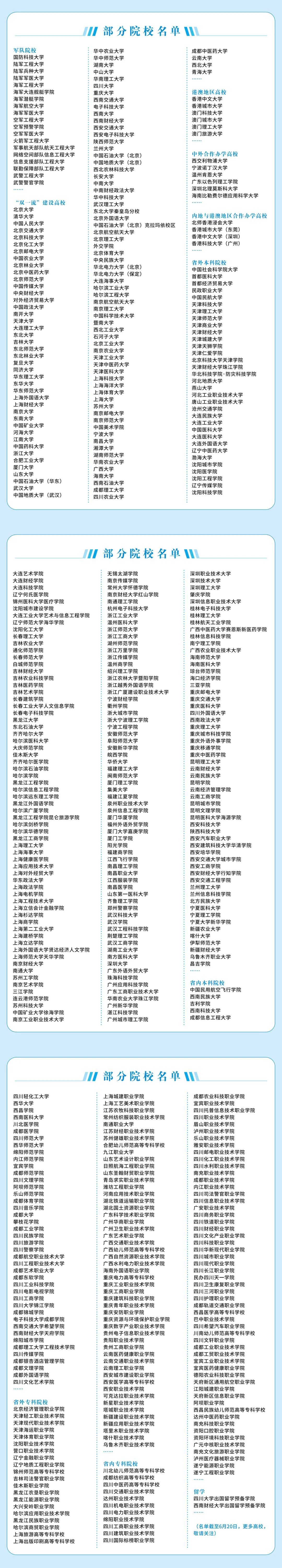 6月25日—27日,成都、泸州、绵阳、南充、宜宾、达州六个城市,全国近600所在川招生院校,包括军队院校、“双一流”建设高校、港澳地区高校、中外合作办学高校、省内外其他普通本、专科院校(名单附后)将面对面接受考生及家长的咨询,为考生介绍大学的招生政策、学科优势、专业设置、就业特点等内容。(此前报道:免费参加!四川省2025年普通高校招生咨询会安排出炉)