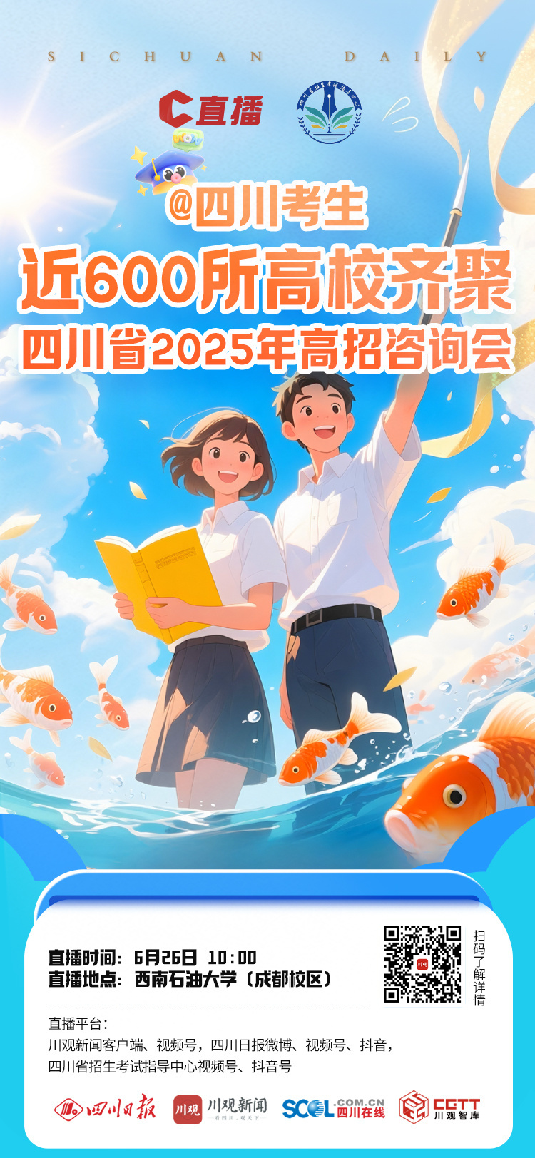 收看平台:川观新闻客户端、视频号,四川日报微博、视频号、抖音,四川省招生考试指导中心视频号、抖音号