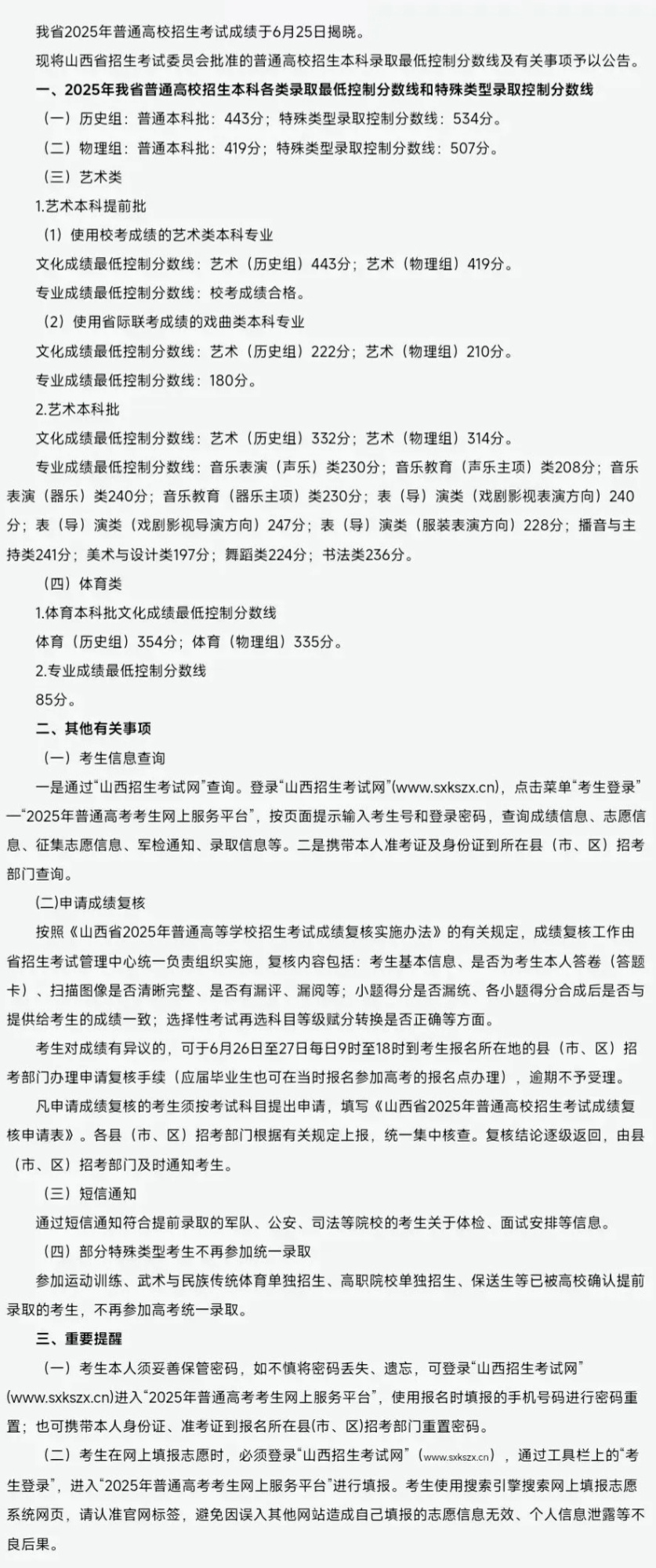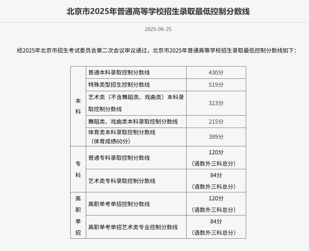 天津市2025年普通高考艺术类、体育类本科批次文化课录取控制分数线确定。艺术类(不含舞蹈类、戏曲类)本科批次录取控制分数线357分;艺术类中舞蹈类、戏曲类本科批次录取控制分数线313分;体育类本科批次录取控制分数线419分。