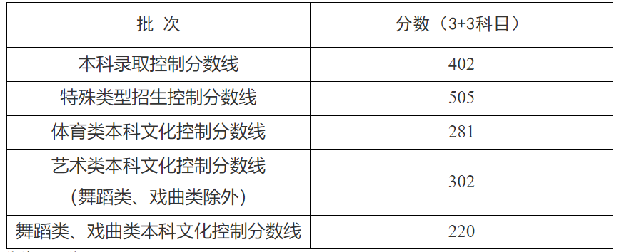 体育类历史类别文化349分、专业261分;体育类物理类别文化325分、专业261分。艺术类平行组中,音乐类文化324分、专业203分;舞蹈类文化303分、专业225分;播音与主持类文化405分、专业211分;美术与设计类文化324分、专业218分;书法类文化324分、专业230分;表(导)演类分3个方向,其中,服装表演类文化303分、专业220分,戏剧表演类文化303分、专业240分,戏剧影视导演类文化303分、专业239分。高职专科录取控制分数线:普通类200分;艺术、体育类文化160分,专业155分。