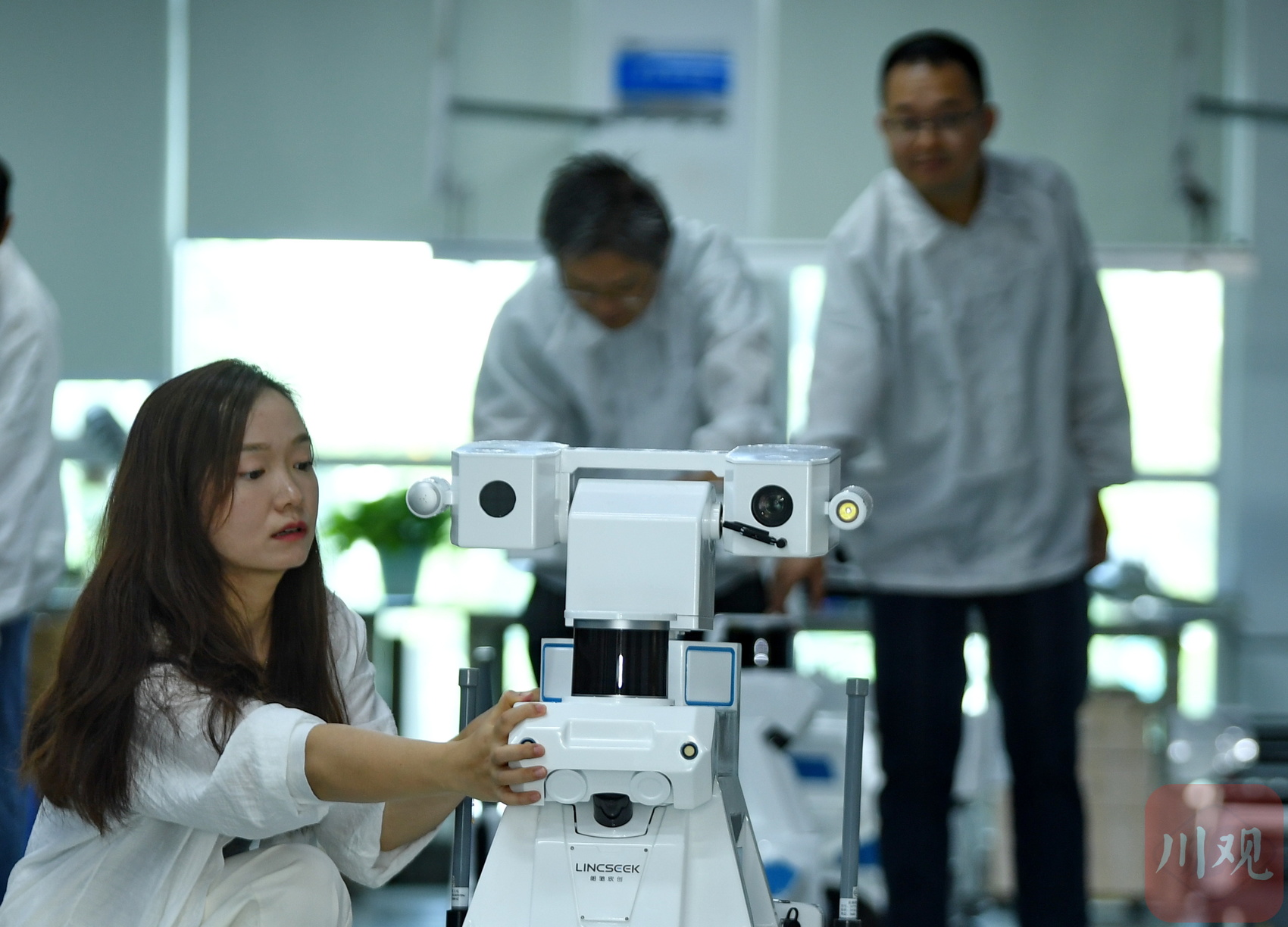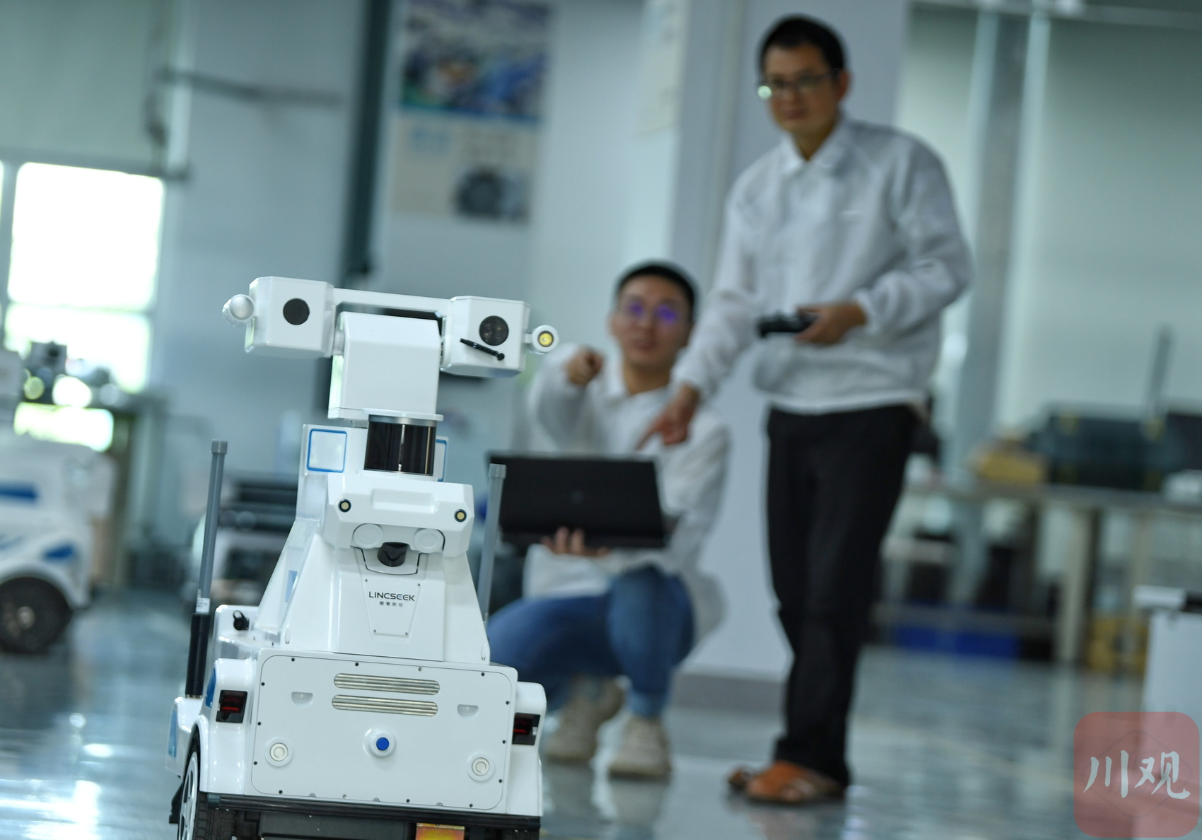 2025年6月25日,在成都市双流区的电子科大科技园(天府园)成都慧拓自动控制有限公司机器人制造产线,科研人员正在检测巡检机器人性能。