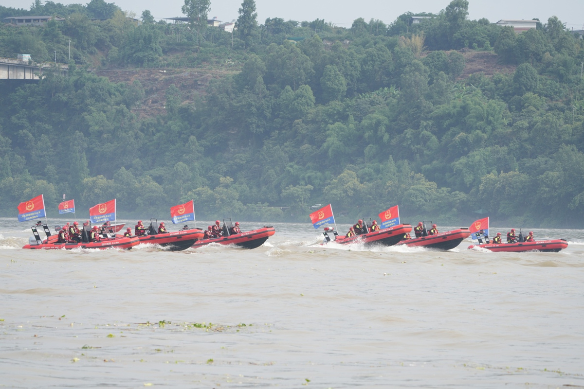 岷江江面上,20多艘救援舟艇围成“O”字阵型,挡住激流,营救落水者……6月25日,四川省消防救援总队2025年度防汛抗洪实战拉动演练在乐山市犍为县举行。