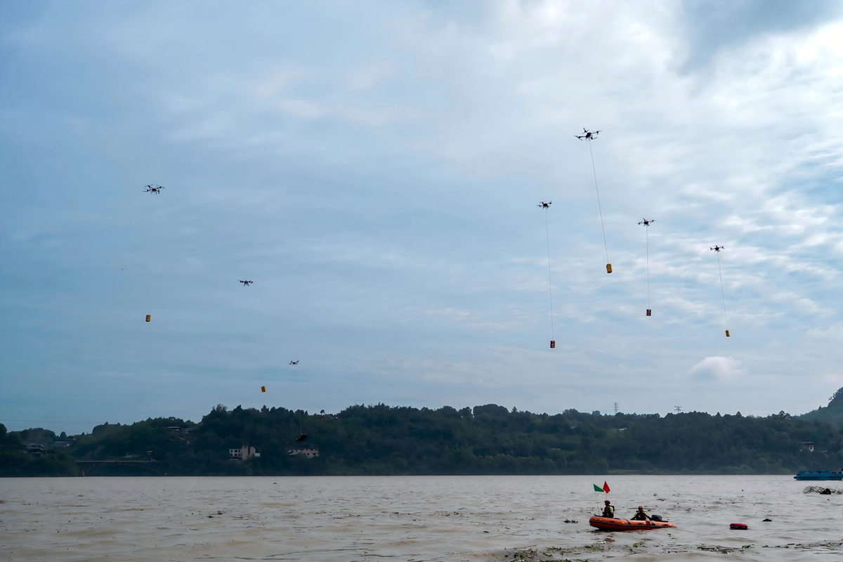 载重无人机远距离投送救援物资。