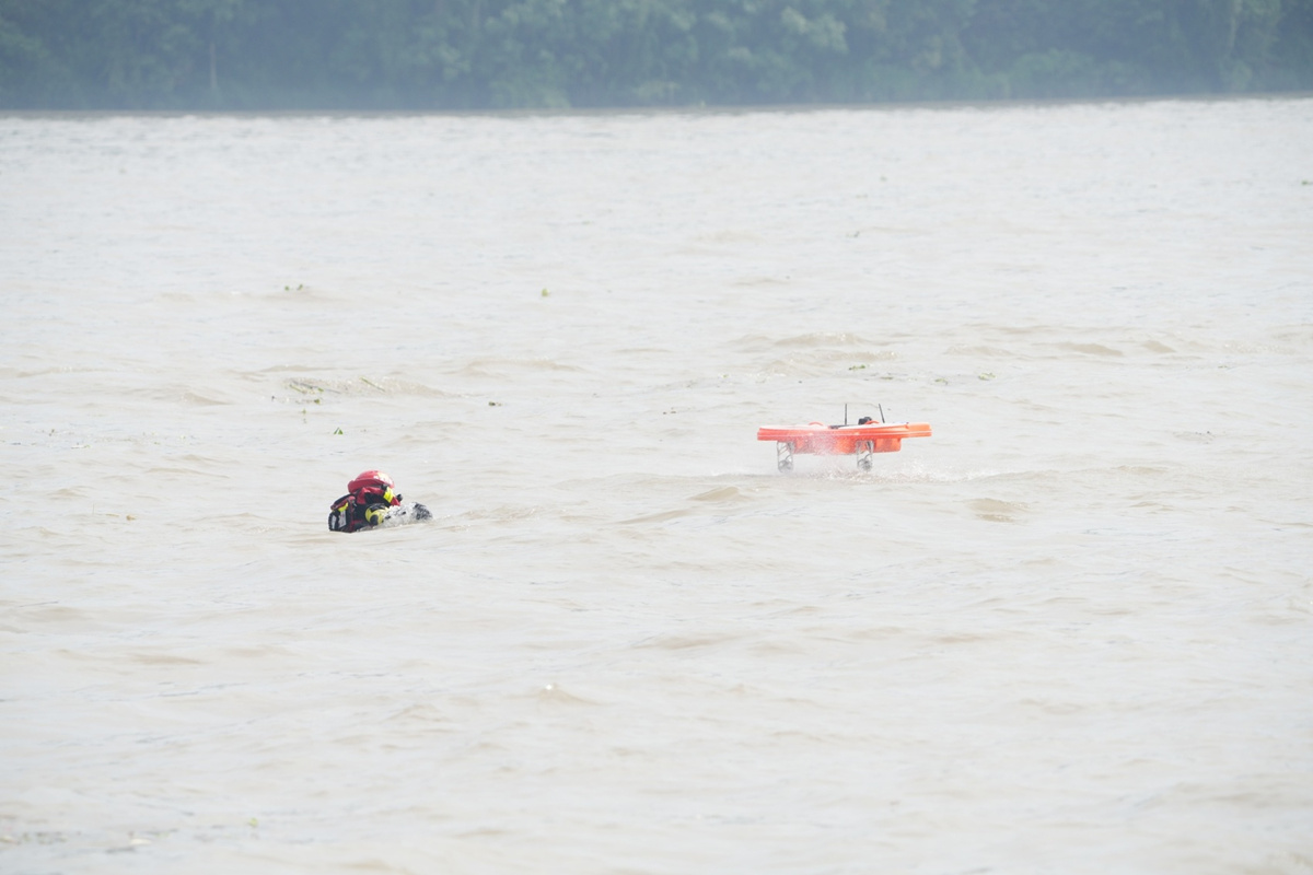 车辆落入水中如何救援?演练中,声呐设备对水域开展全方面扫描,水下机器人潜入水中侦察,实时传回水下环境画面,方便救援人员确定车辆准确位置。随后,4名消防员潜入水中,为车辆固定打捞浮袋,配合地面人员持续充气增加浮力,逐渐将车辆抬升至水面。此外,针对城市内涝场景,消防员还运用远程供水系统和大流量排涝车进行排涝。