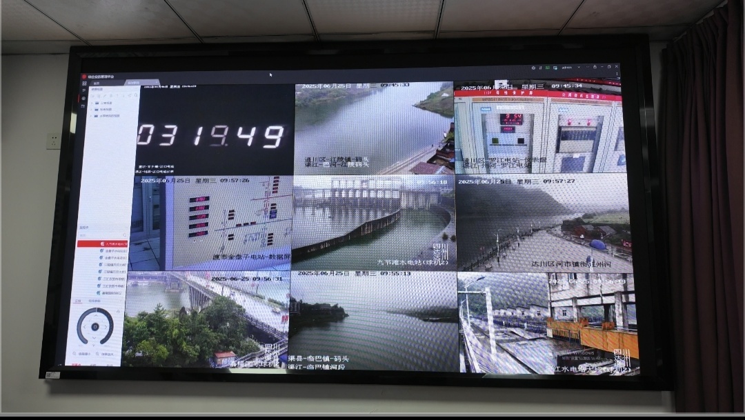 值班室一端的监控大屏上,九个画面实时显示着达州多个电站及主要河流的关键点位。