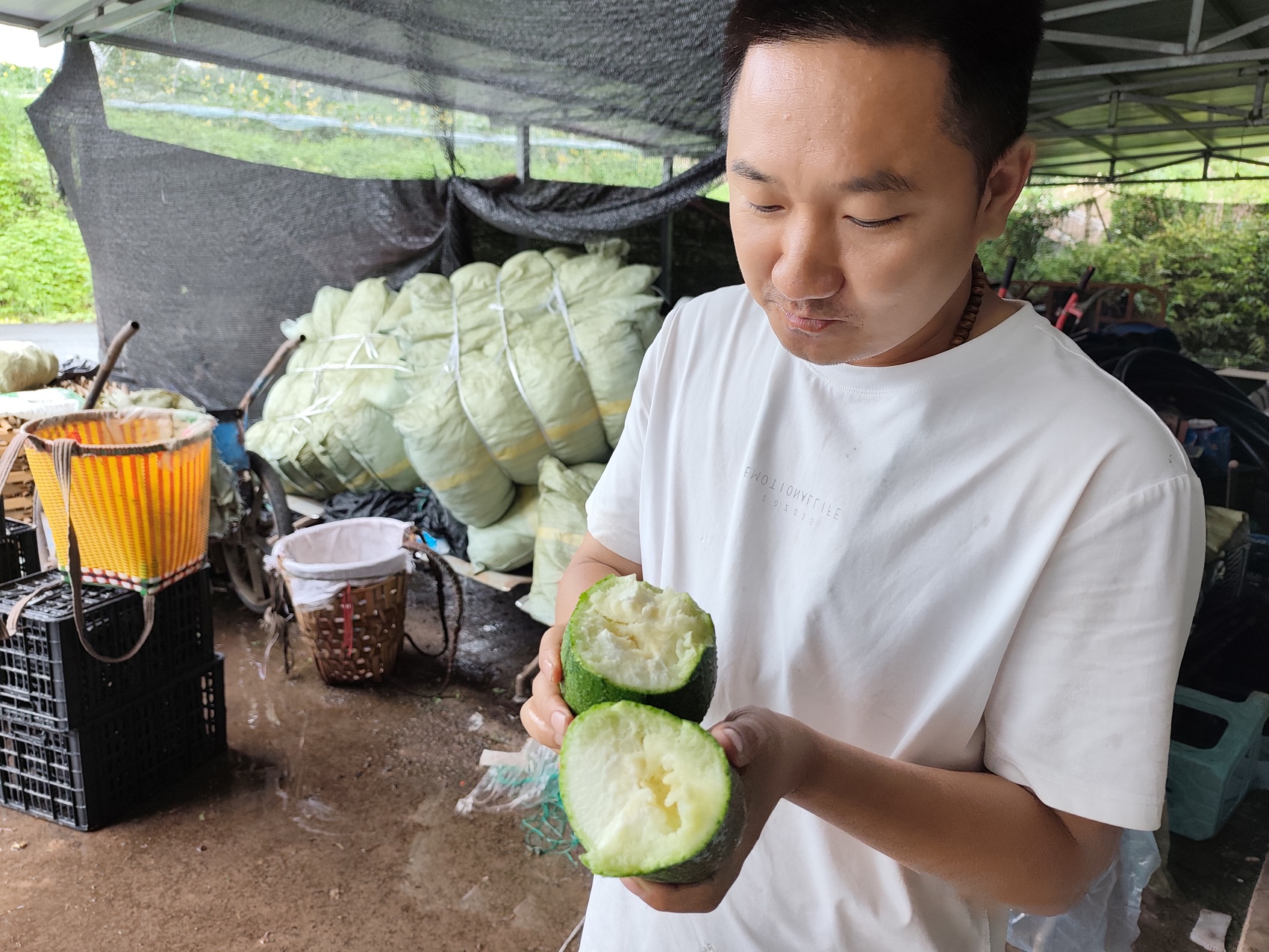6月24日,沐川县底堡乡种植业主邓涛当场拿起一个“短胖短胖”的丝瓜,一掰为两节,随后对着洁白如玉的瓜瓤大快朵颐,直呼:“这个丝瓜跟吃水果一样,非常好吃!它的清香味很重,口感很好!”