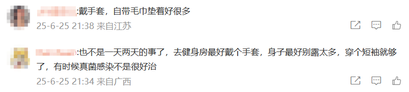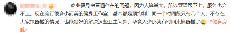 也有网友表示,健身房是公共场所,人流量大,很容易清洁不到位。