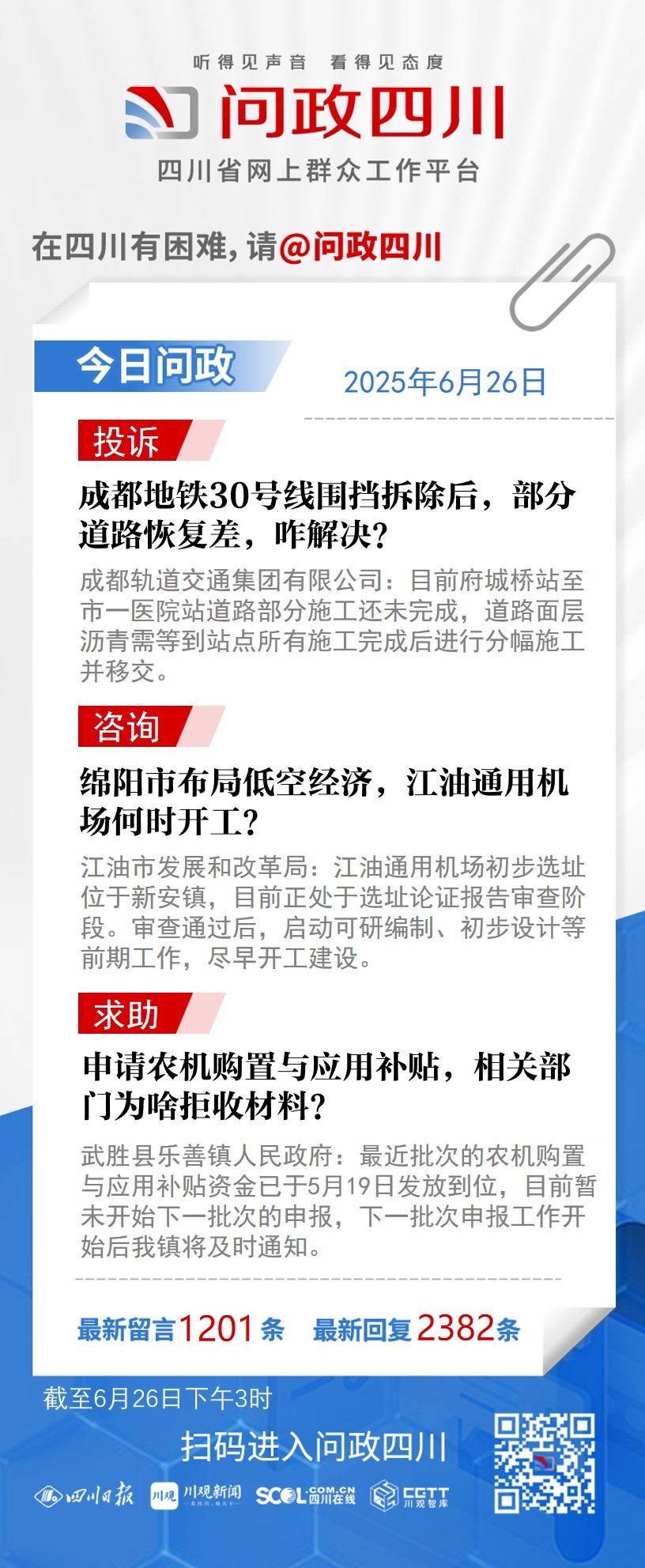 在四川有困难,找问政四川。如果您在四川遇到了操心事、烦心事、揪心事,请登录“四川省网上群众工作平台—问政四川”或拨打问政四川热线(028-96001)留言反映、求助或建议。我们将充分发挥平台的互动联系作用及舆论监督功能,第一时间传递民声,推动问题得以及时解决——听得见声音,看得见态度。