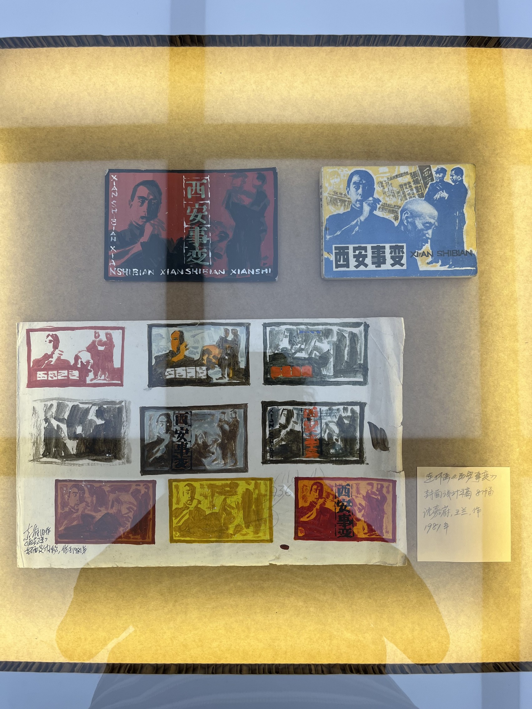 沈嘉蔚、王兰创作的《西安事变》就很典型。现场不仅展出32开、64开两种开本的连环画,还包括一系列素材照片、草图,以及创作中用于探索视觉风格设定的废稿。甚至,两位作者画在一张“辽宁美术出版社连环画专用纸”背面的近10幅封面设计稿,也被搬到展览上。