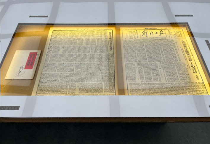 另一张1943年的《解放日报》,纸张早已泛黄,还有明显的虫蛀痕迹。然而,它却是展览的思想核心,因为上面全文登载了《在延安文艺座谈会上的讲话》。