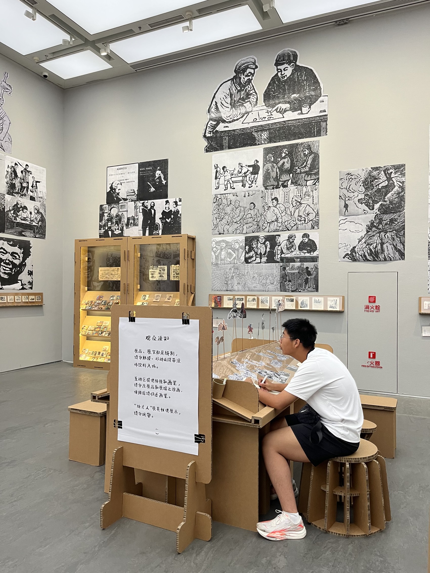 在观众视角中,展览是这样的:展厅入口,做成了一个隧道的形式,顶部安放了16部投影仪,将艺术家的作品轮番展示出来。穿过隧道步入展厅,眼前是一个瓦楞纸板的世界,无论是隧道本身,还是展台、展柜,还是供观众歇脚、画画的凳子、桌子,全都用瓦楞纸板手工拼接而成。