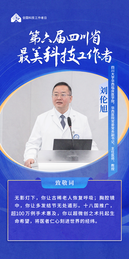 获评第六届四川省最美科技工作者感言:荣誉属于全体奋战一线的医学科研工作者。从医四十载,我始终坚信创新是责任——唯有直面临床痛点,以技术革新化解患者之痛,方不负“科技工作者”之名。感恩时代赋予的机遇,更感谢团队并肩攻坚。未来我将继续深耕微创领域,探索生命精妙,守护健康。