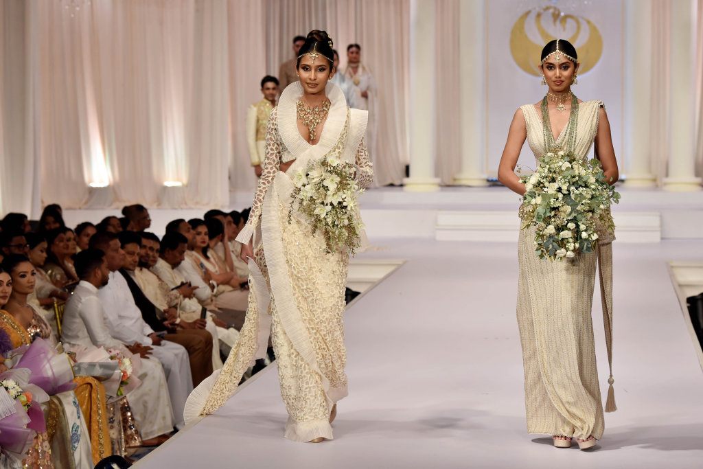 6月24日,在斯里兰卡科伦坡举行的一场婚纱发布会上,模特展示婚纱作品。
